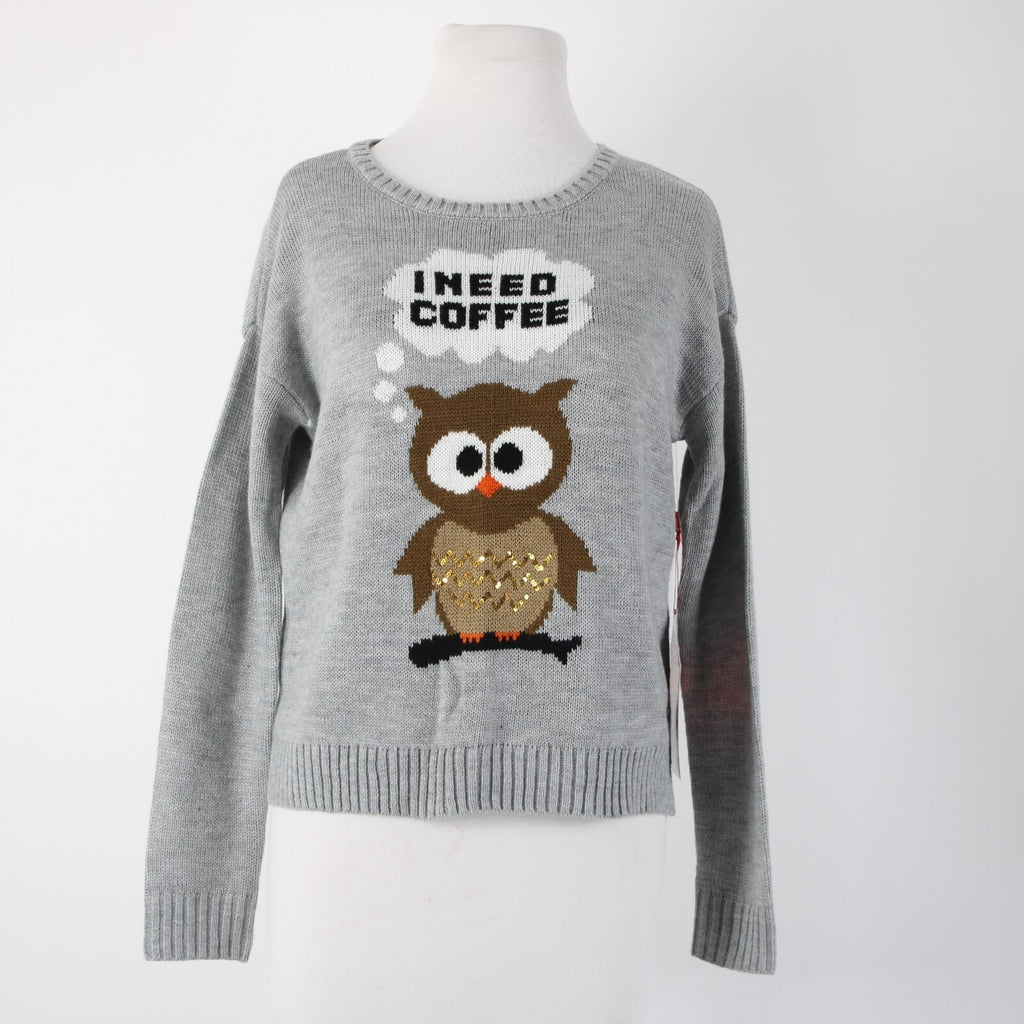 Almost Famous NEW $49 Sz XS Gray Multi Color 'I Need Coffee 100% Acrylic Sweater
