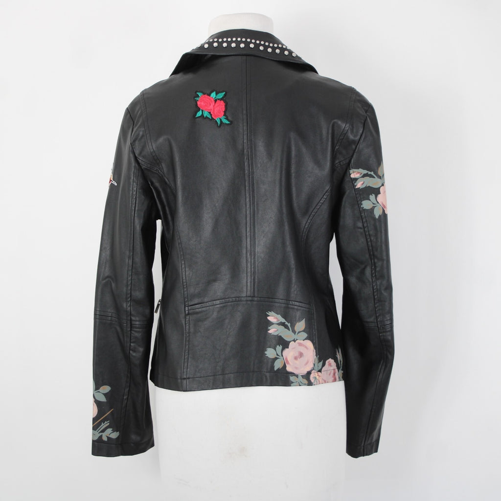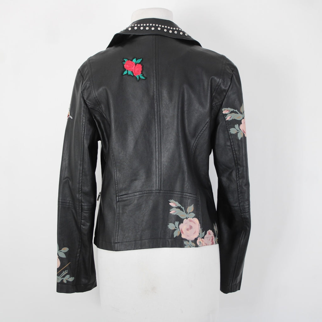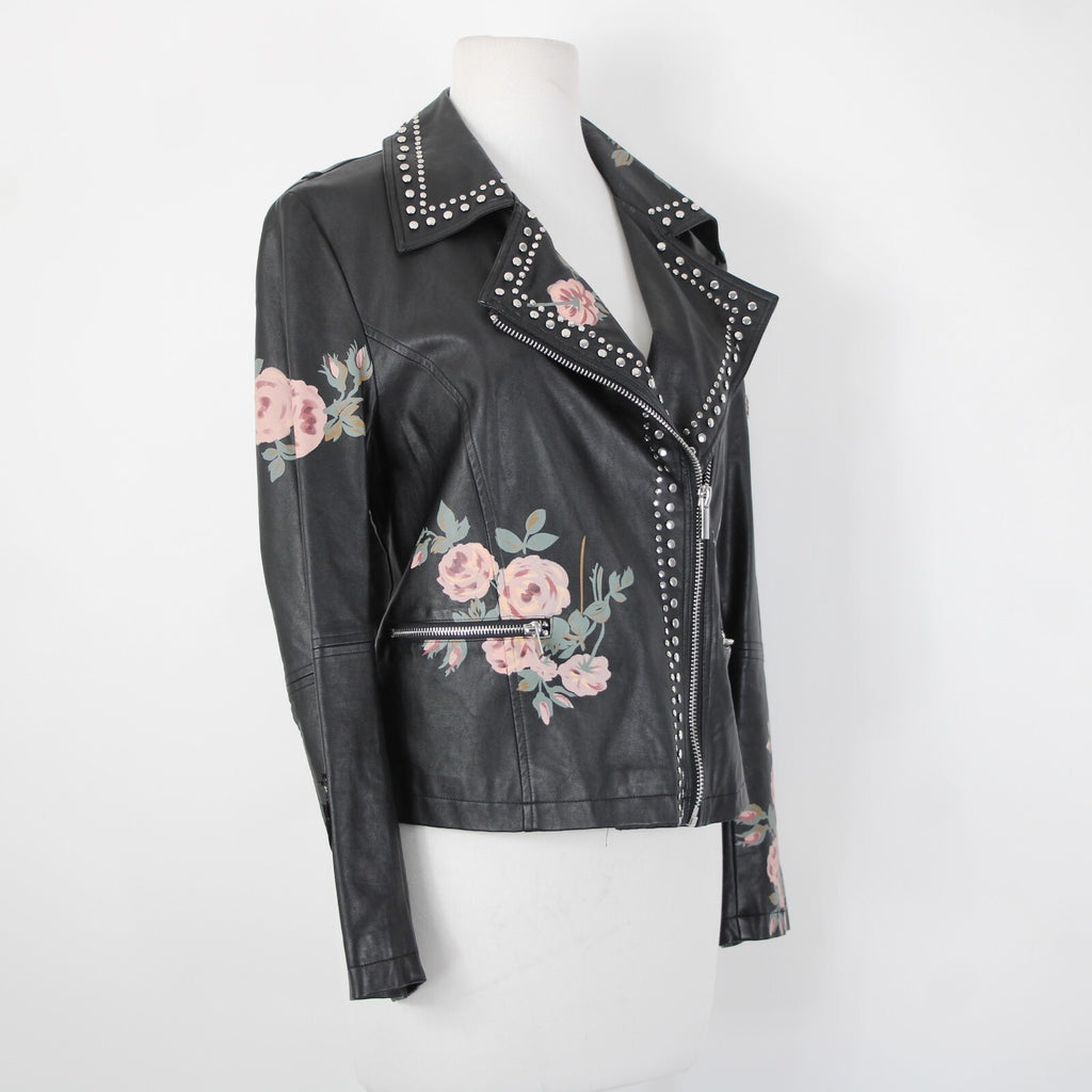 Bagatelle Sz S Black Pink Floral Stud Zipper Pockets Faux Leather Poly Jacket
