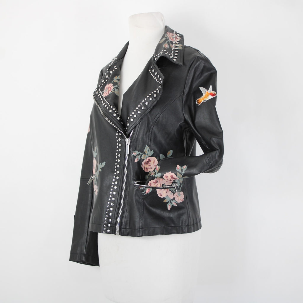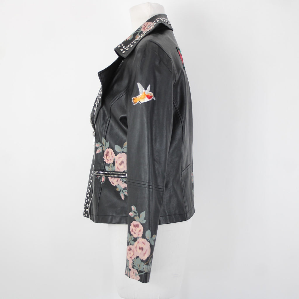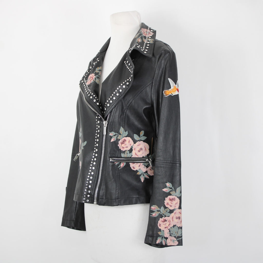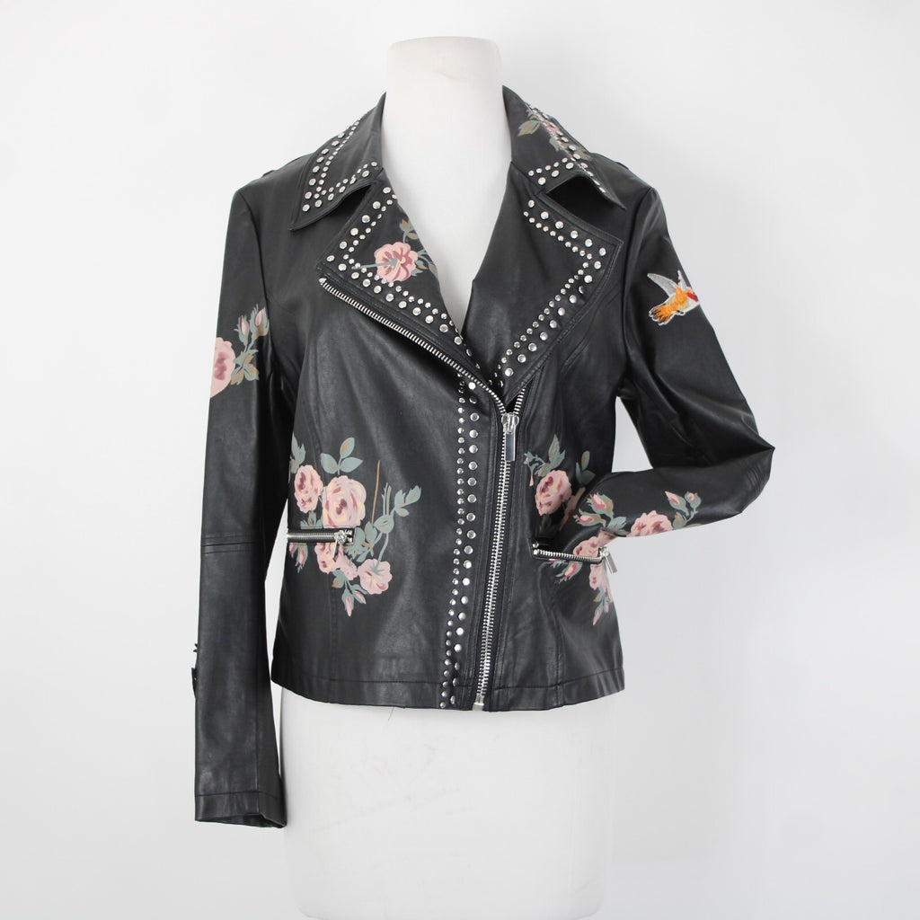 Bagatelle Sz S Black Pink Floral Stud Zipper Pockets Faux Leather Poly Jacket