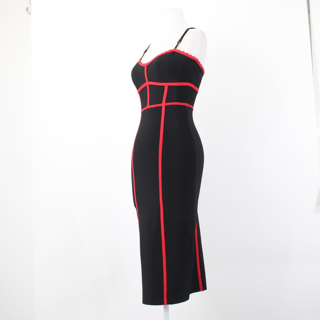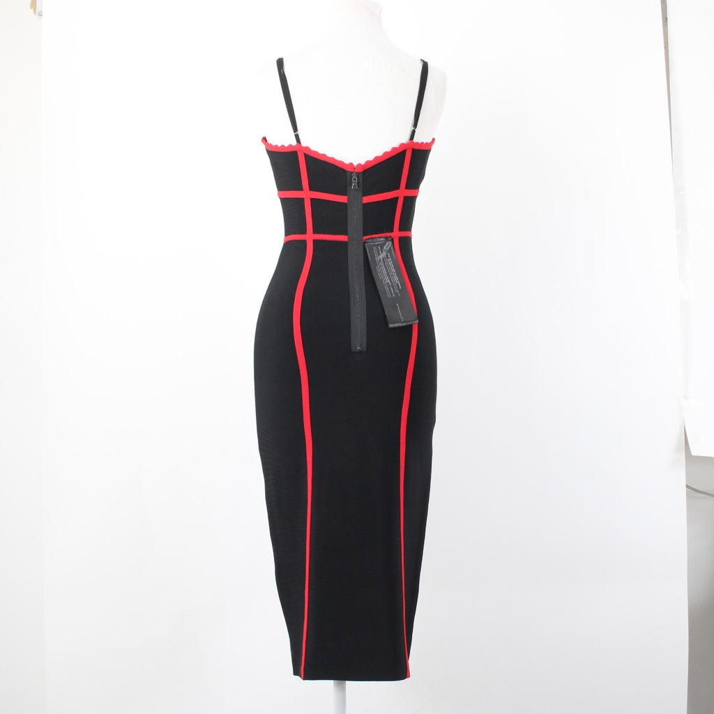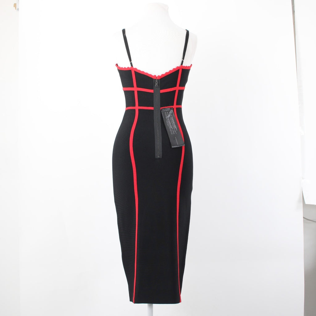BCBG NEW $328 Sz M Black Red Body Conscious Rayon Nylon Spandex Midi Dress