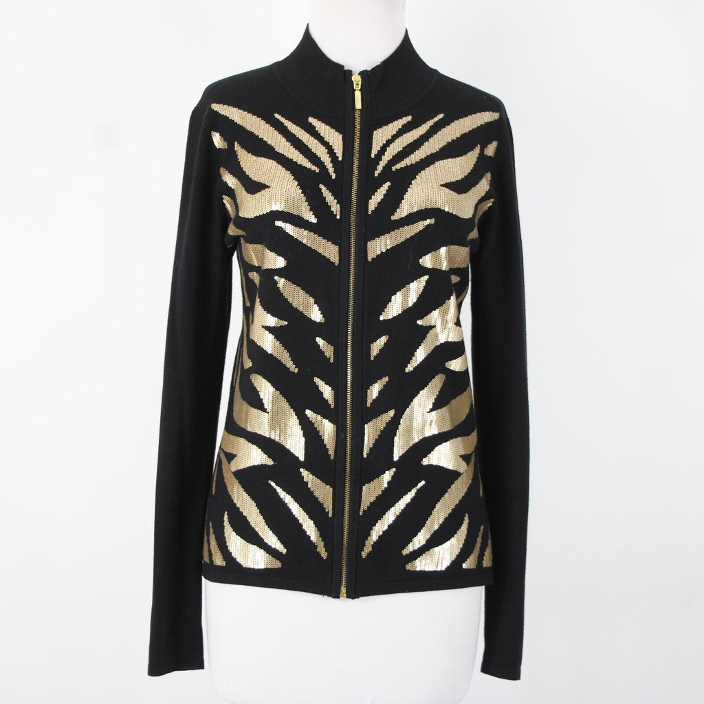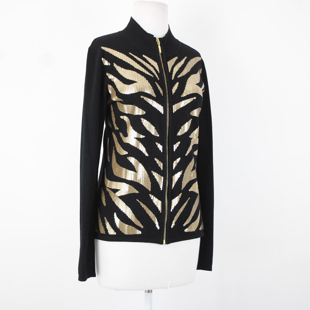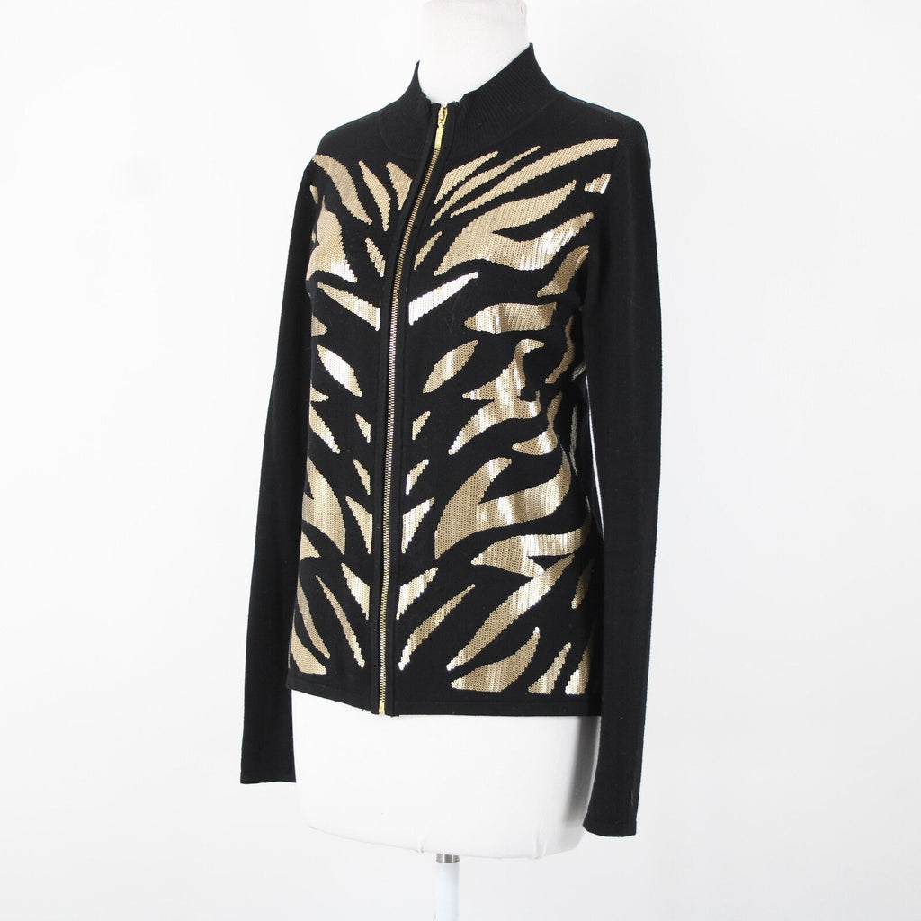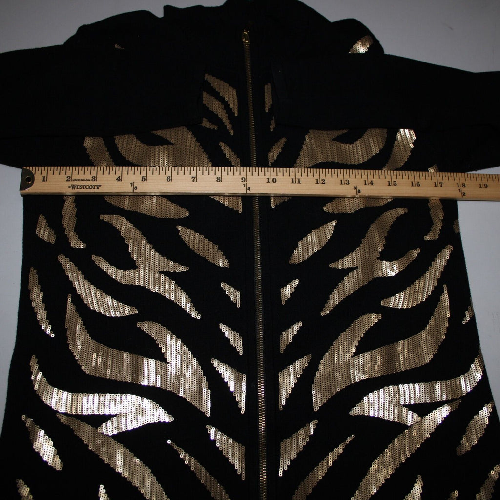 Belldini Sz M Black Gold Animal Sequin Collared Viscose Nylon Cardigan Sweater