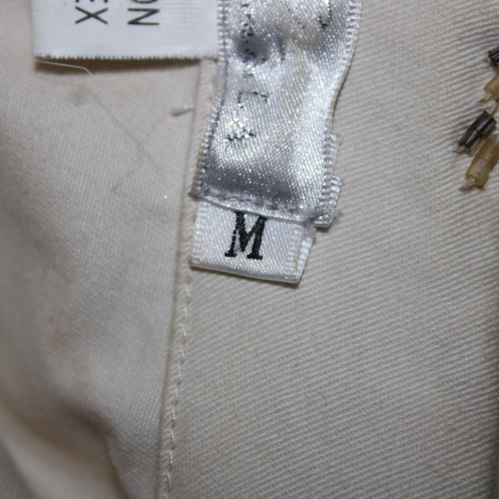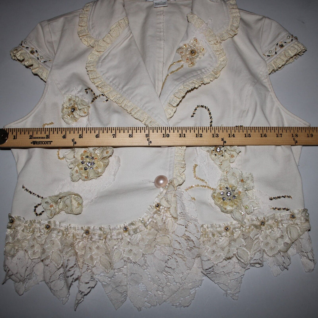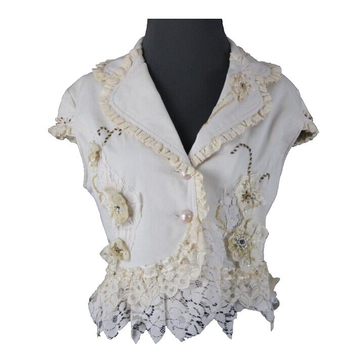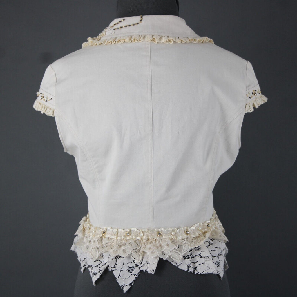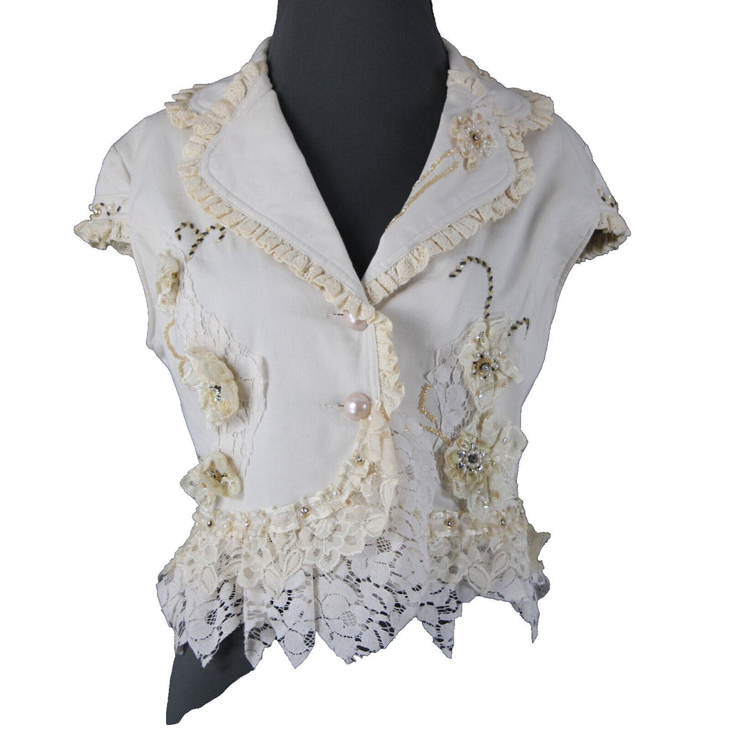 Black Cat Fashion Sz M Cream Tan Beaded Lace Rhinestones Pearls Cotton Top