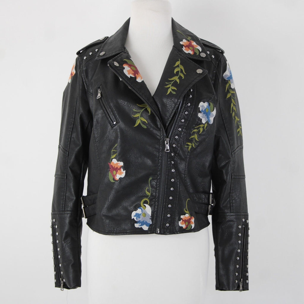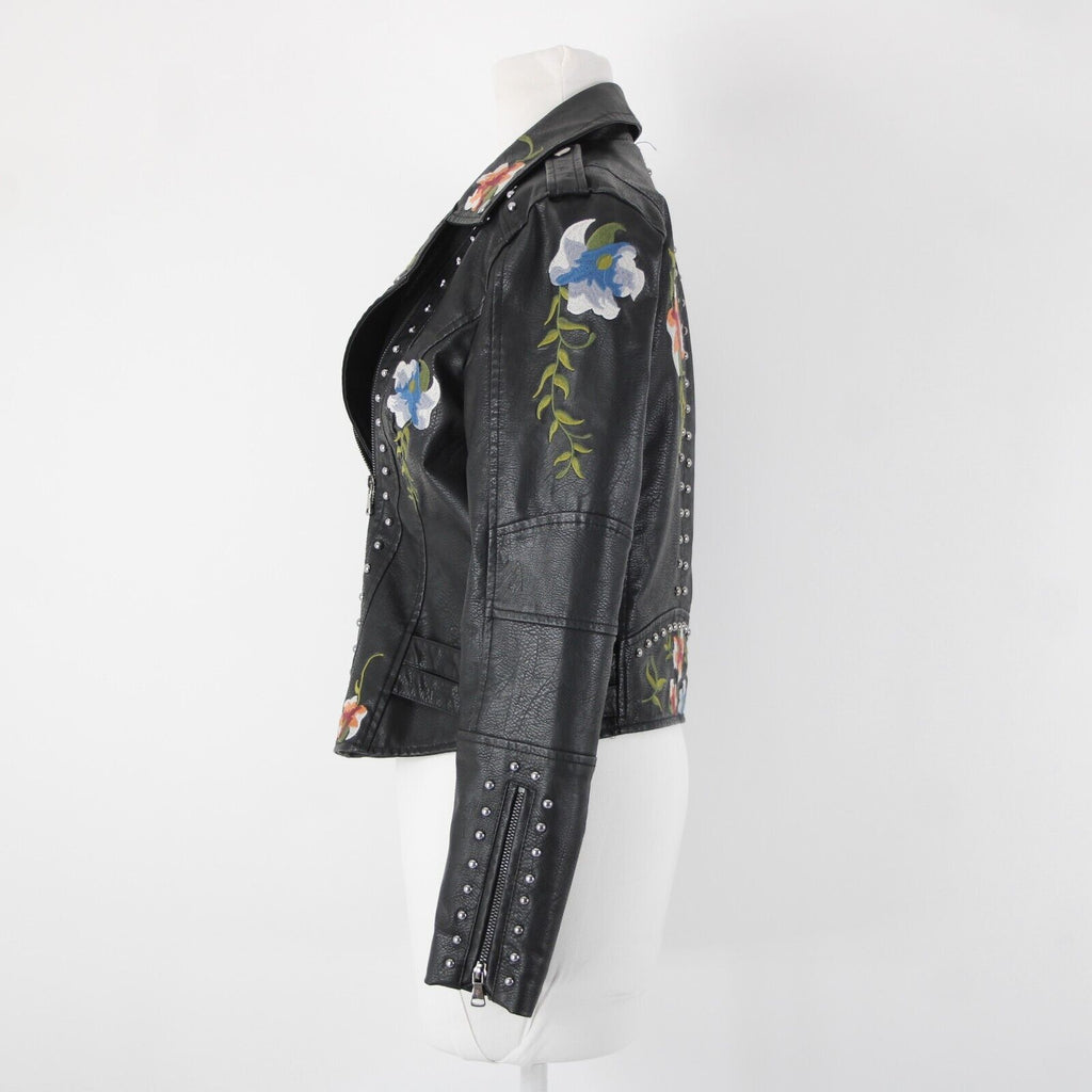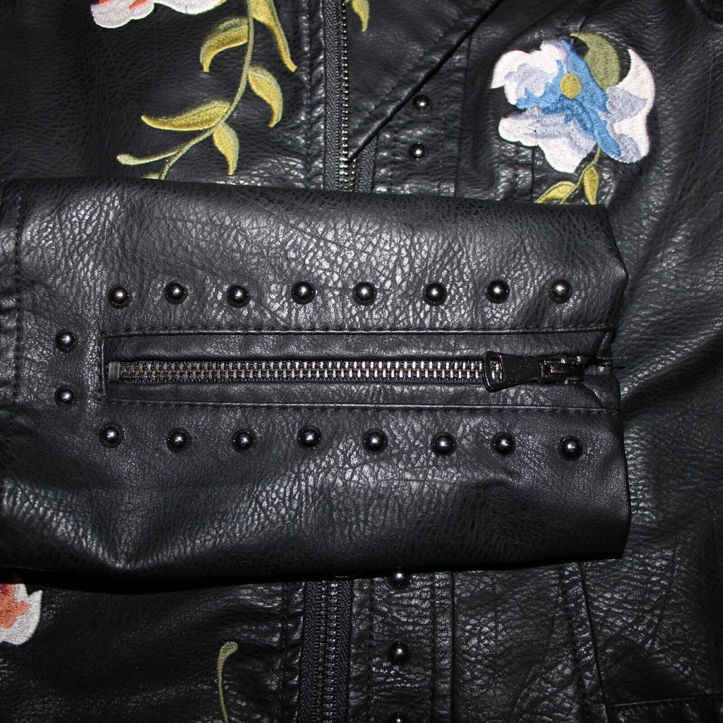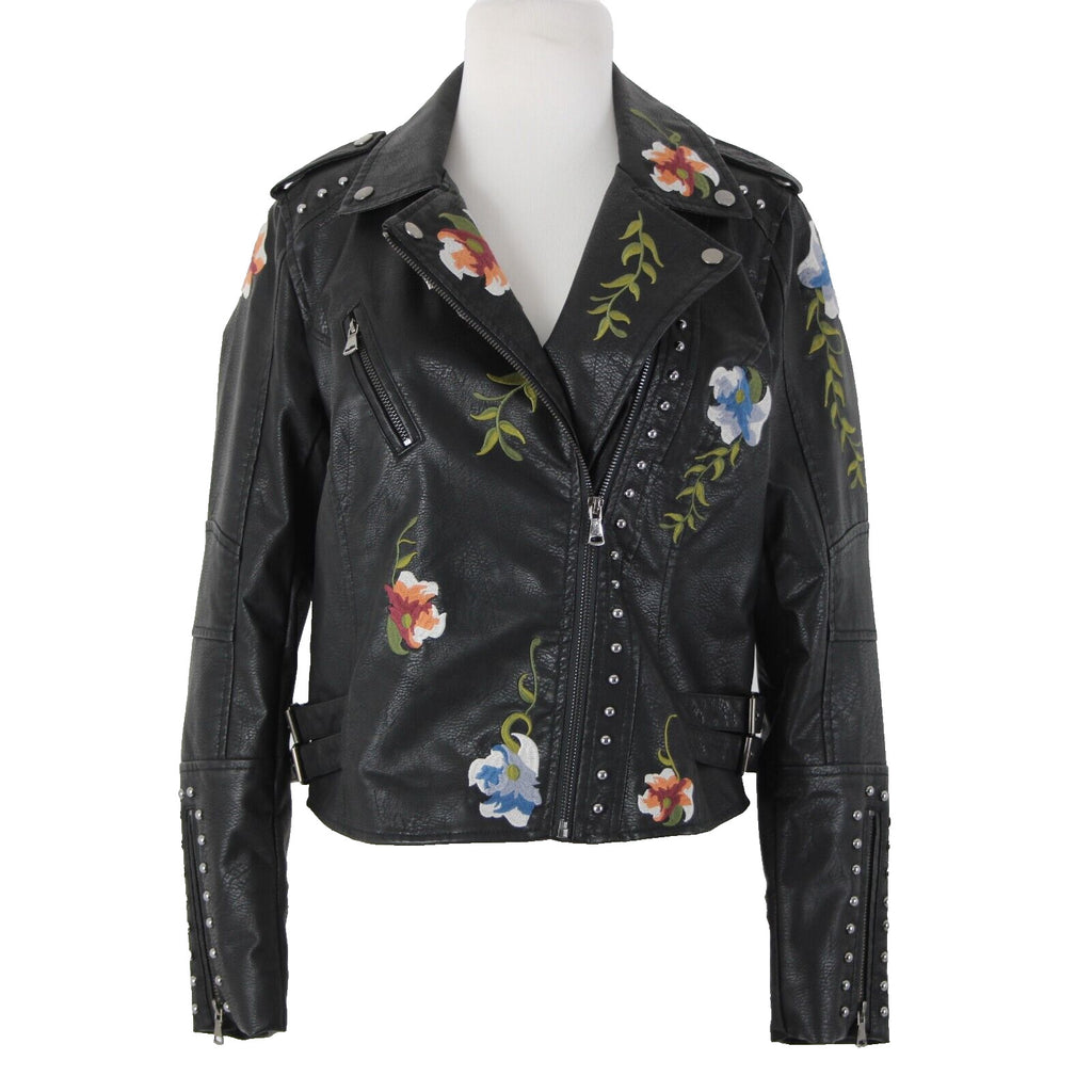 Black Multi Floral Embroidered Studded Leather Polyurethane Lined Moto Jacket