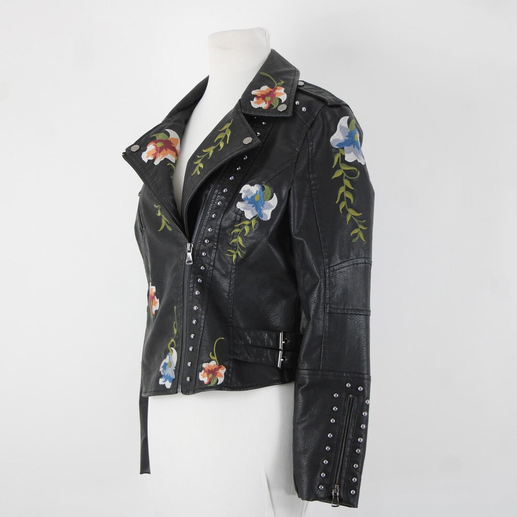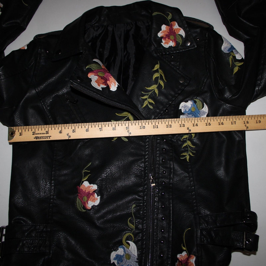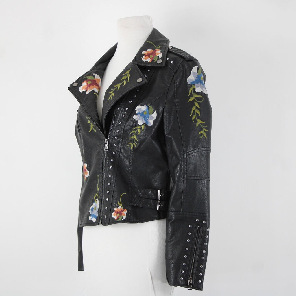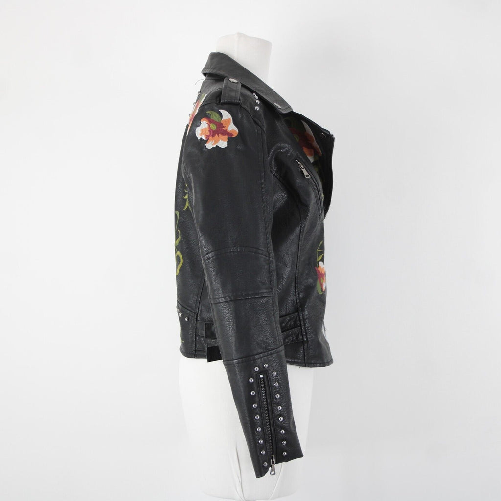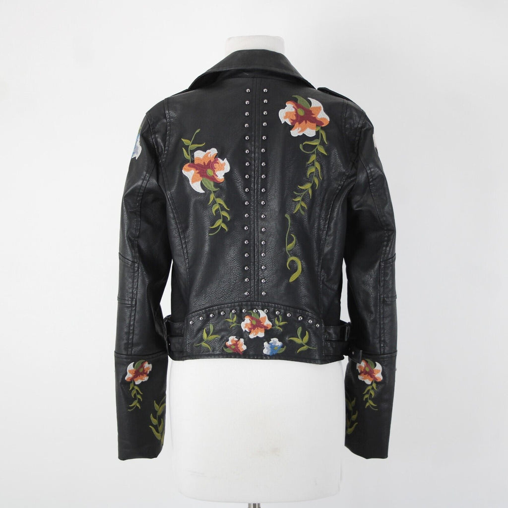 Black Multi Floral Embroidered Studded Leather Polyurethane Lined Moto Jacket