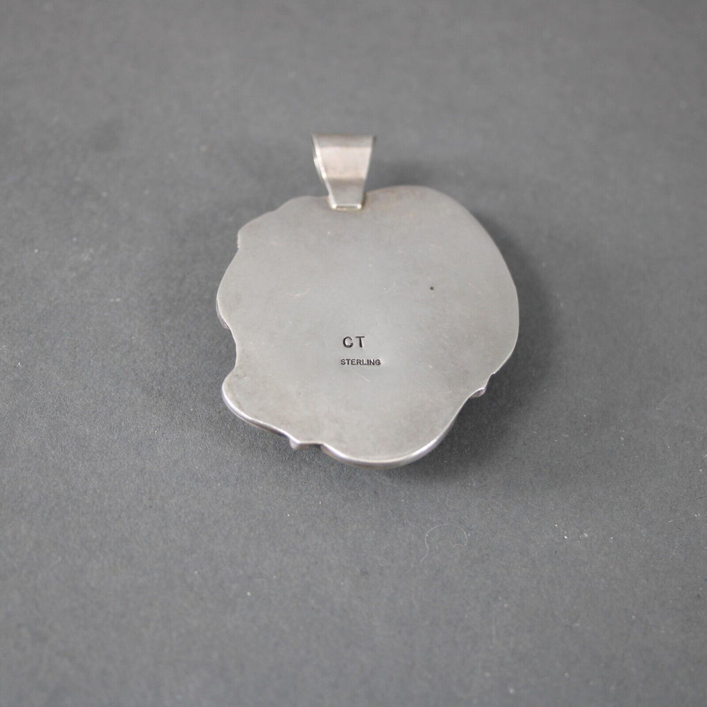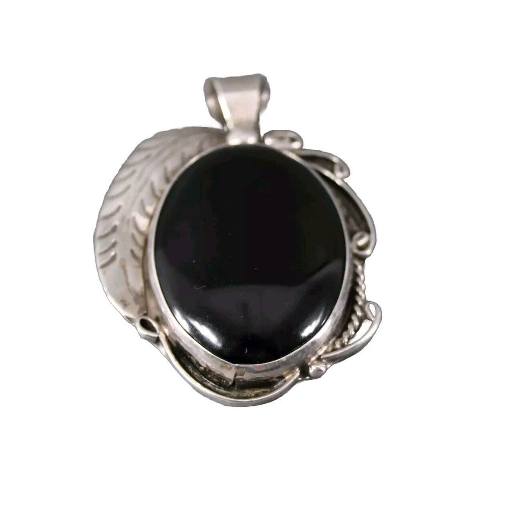 Calvin Tom Sterling Silver Black Onyx Feather Detail Scroll Engrave 2.5" Pendant