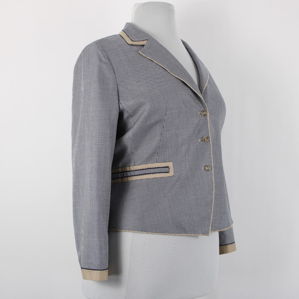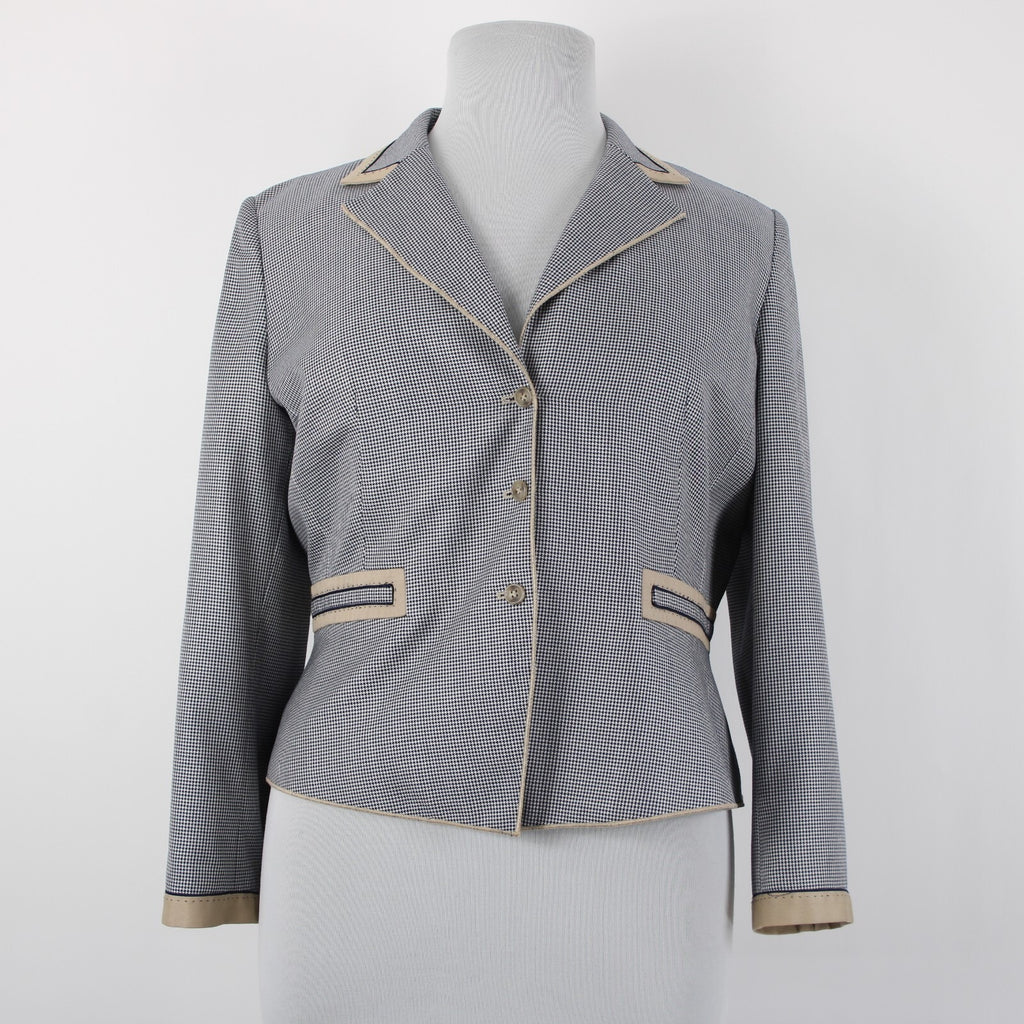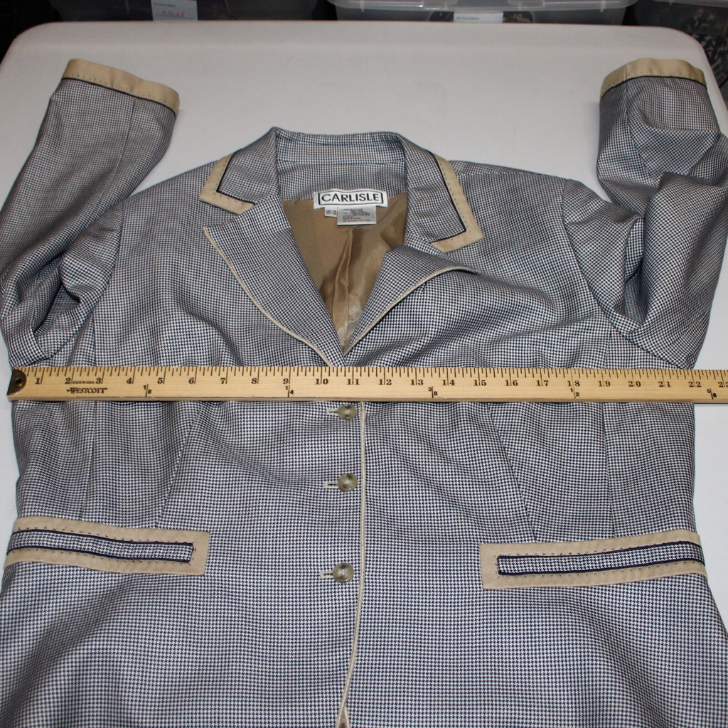 Carlisle Sz 16 Navy Blue White Brown Faux Pockets Lined Silk Wool Cotton Jacket