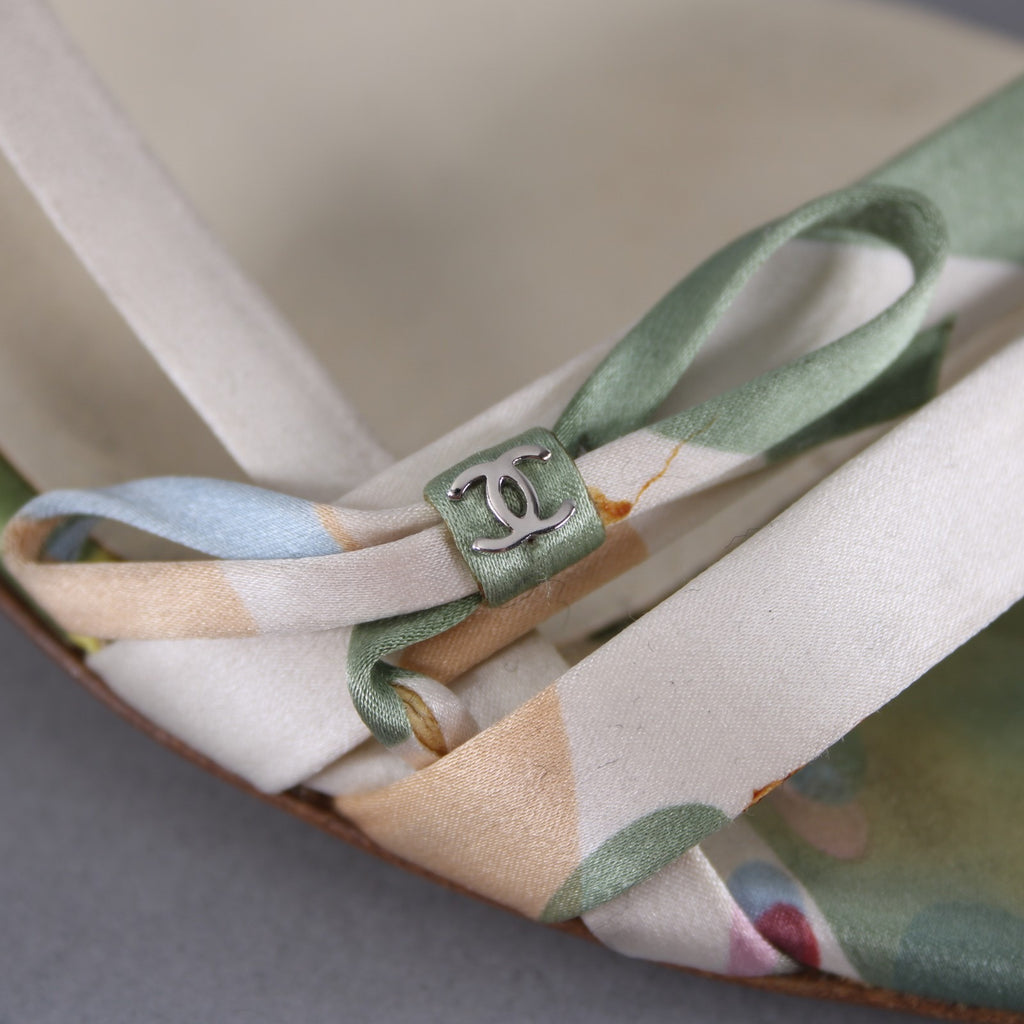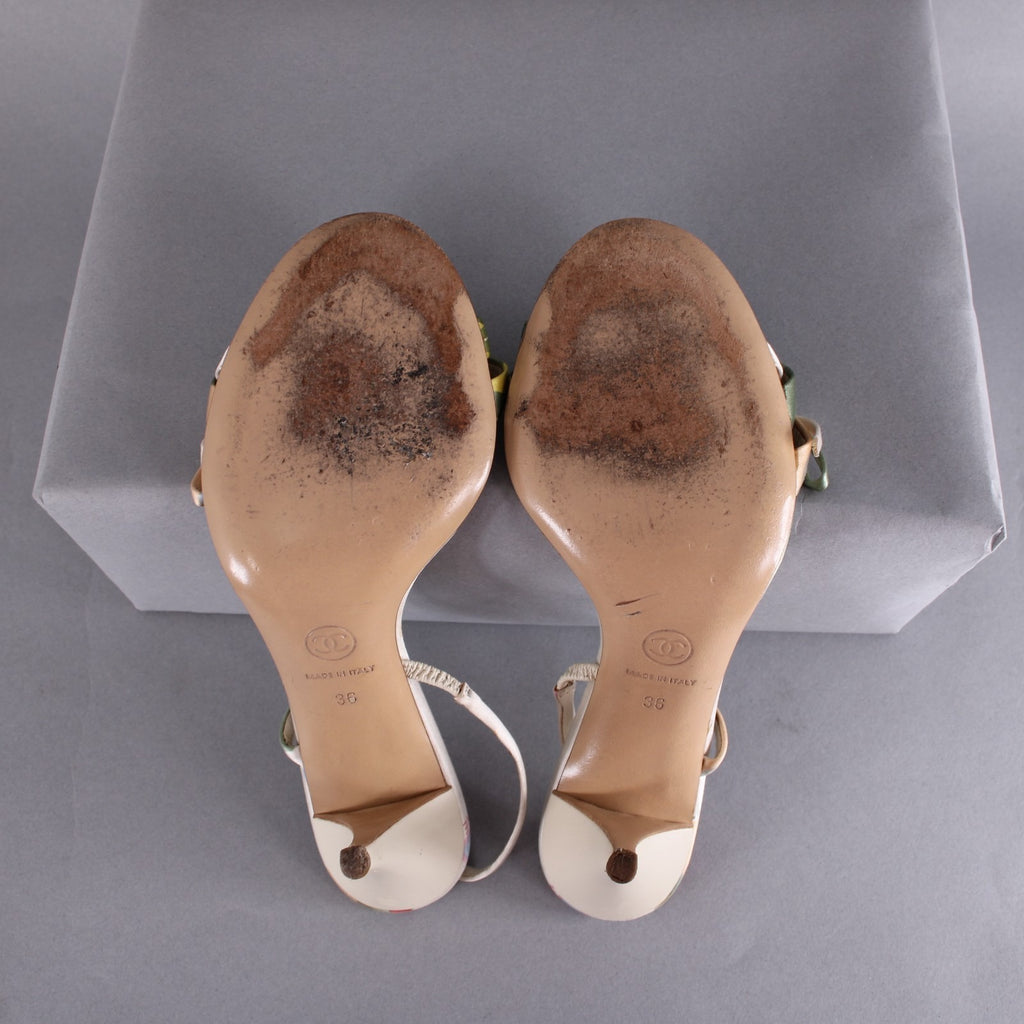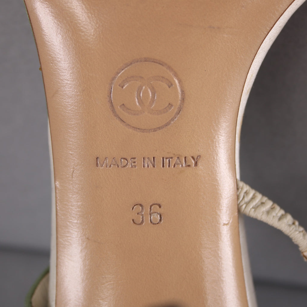 Chanel Heels Sz 36 Green White Multi Color Open Toe Ankle Strap 3" AS IS Heels