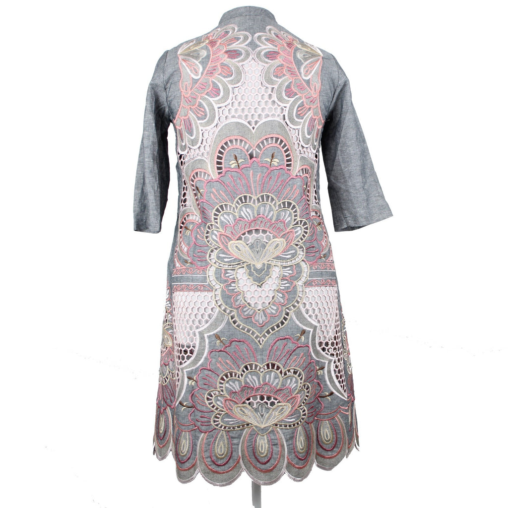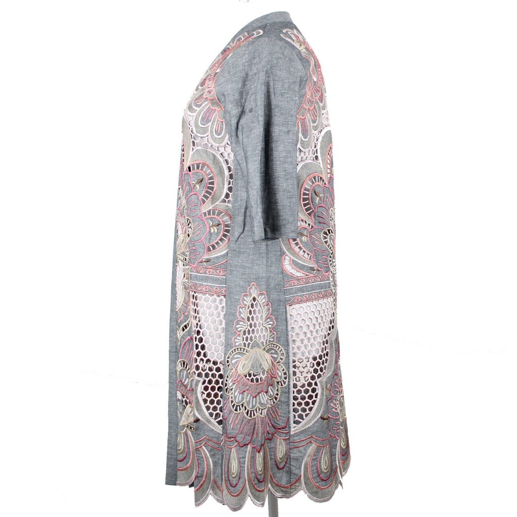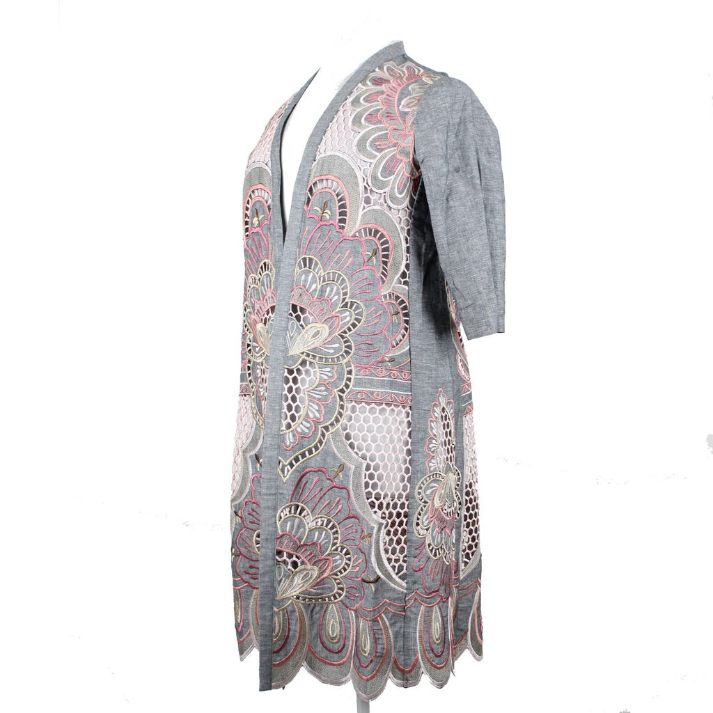 Chicos NEW $199 Sz S M Gray Pink Novelty Kimono Scalloped Hem Linen Poly Jacket