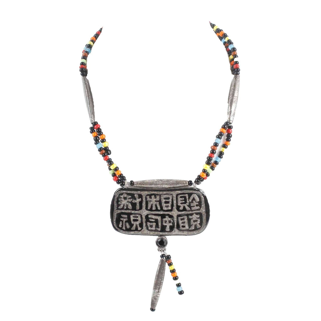 Chicos Sz 15 + 3 in Ext Black Multi Silvertone Beaded Symbols Necklace