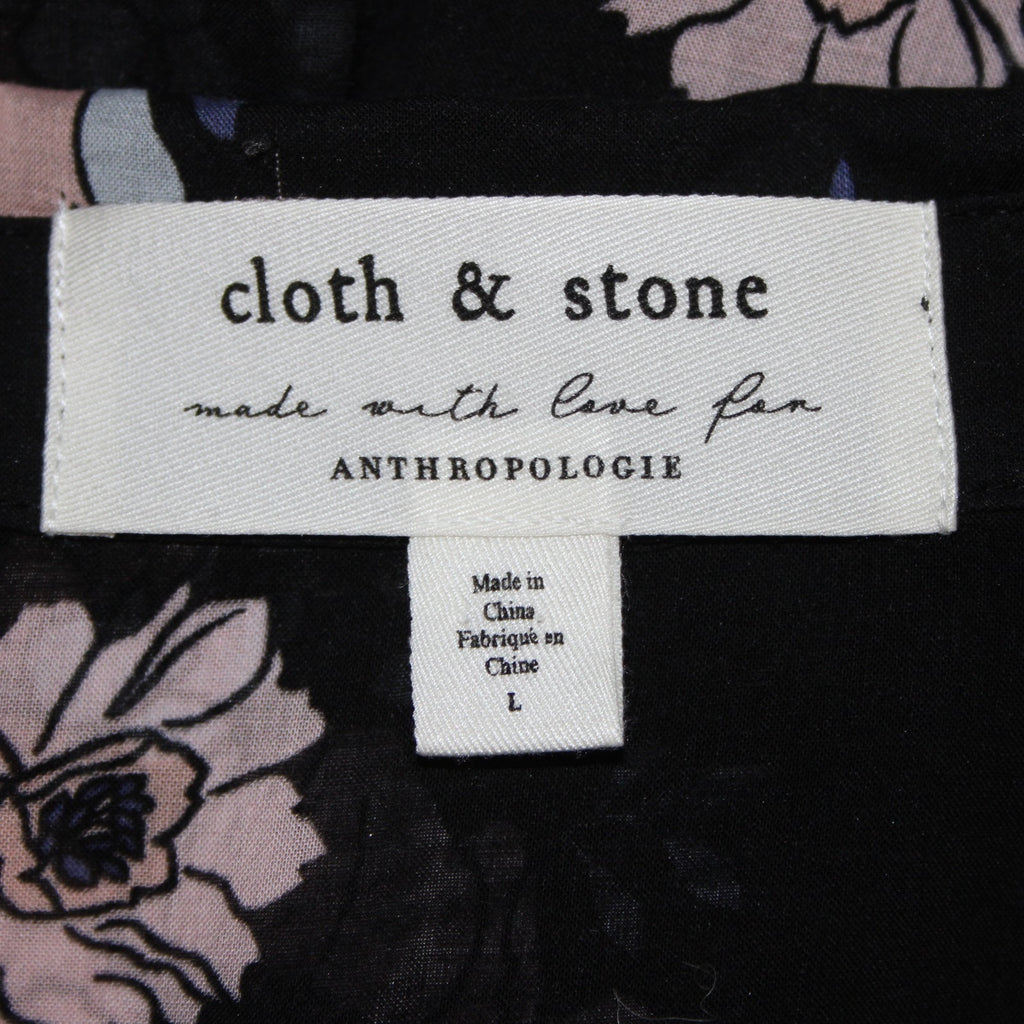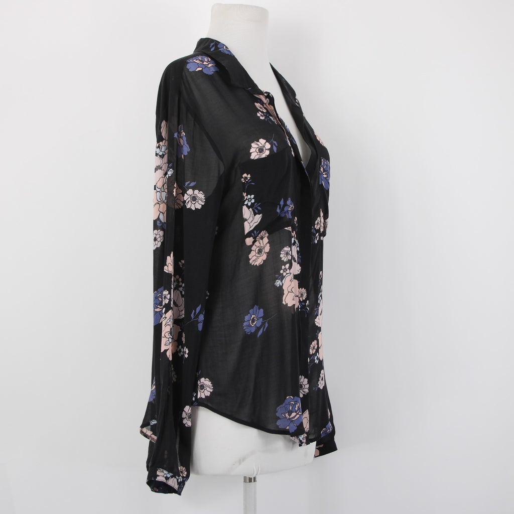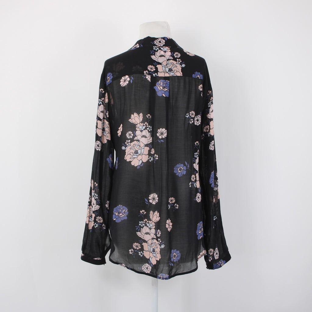 Cloth And Stone Top Sz L Black Blue Multi Color Collared Buttons Sheer Rayon Top