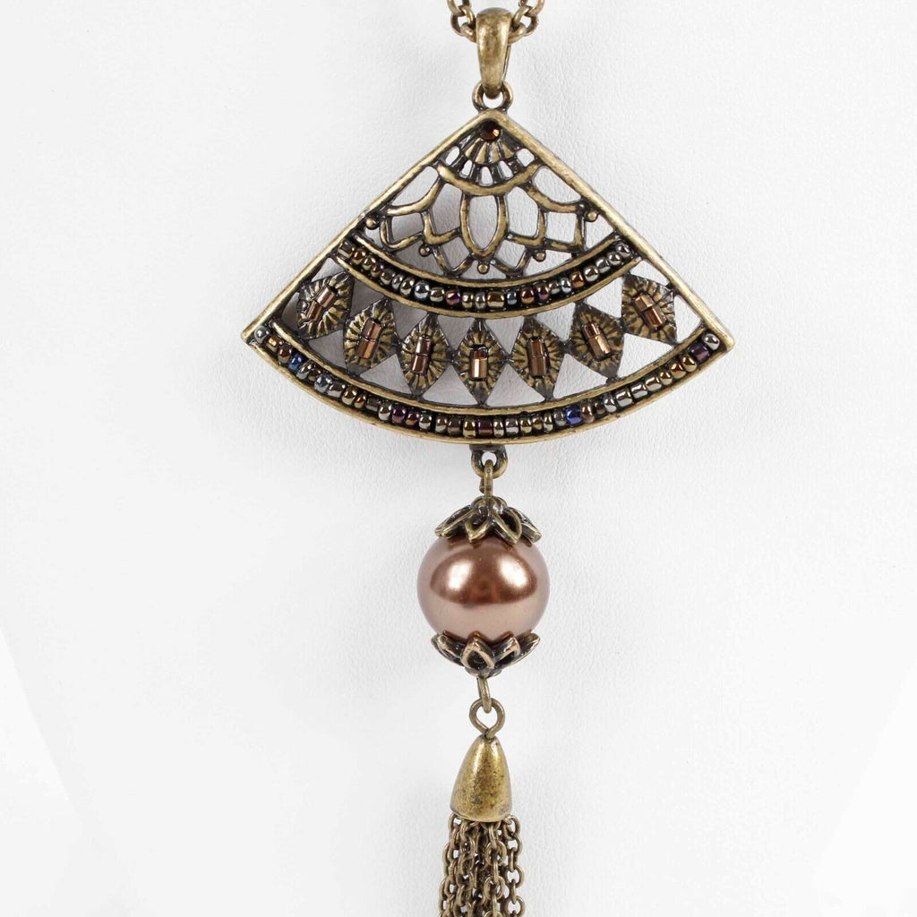 Coldwater Creek 28in Brass Multi Beaded Fan Chain Tassel Pendant Necklace