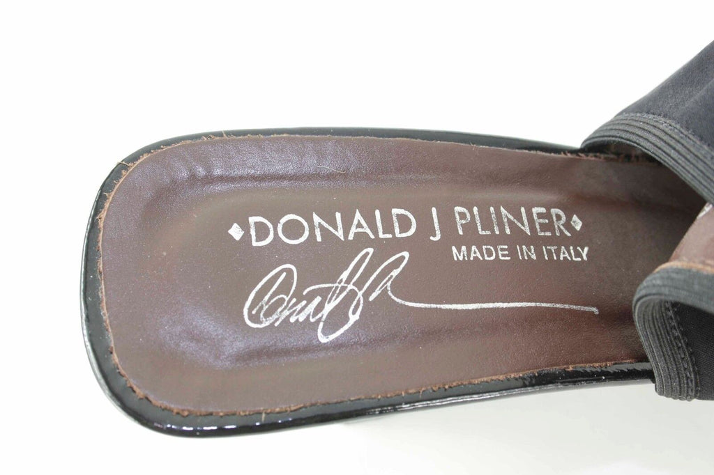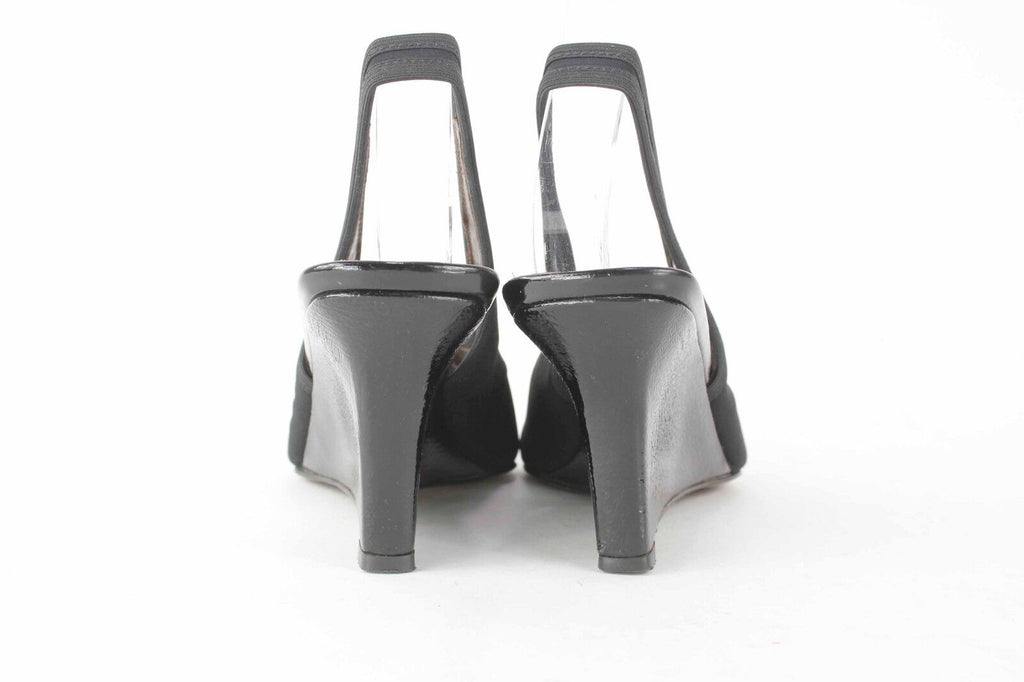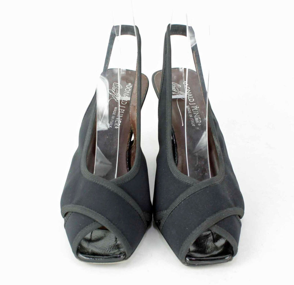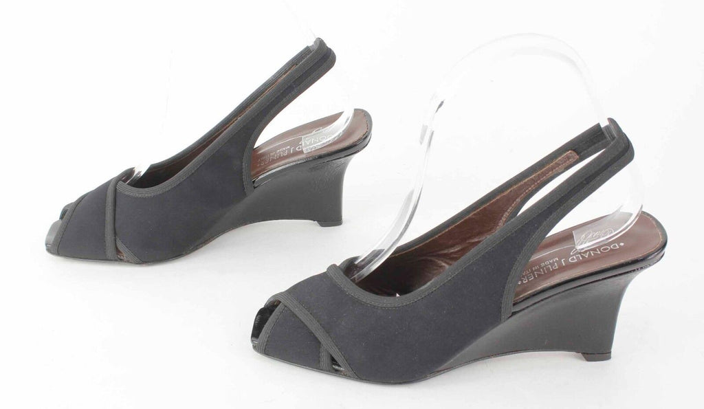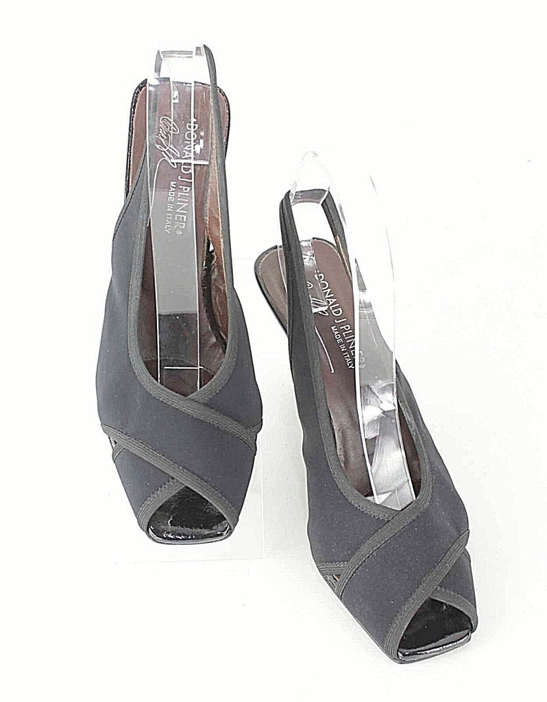 Donald Pliner Sz 8 Black Crepe Elastic Open Toe Slingback Patent 3 Wedge