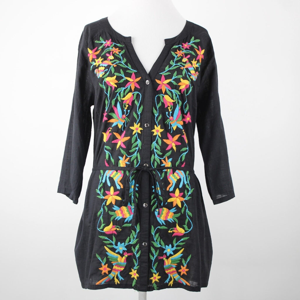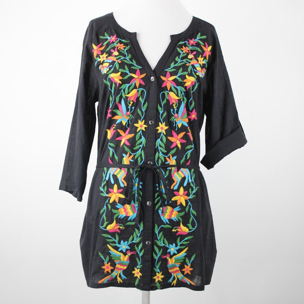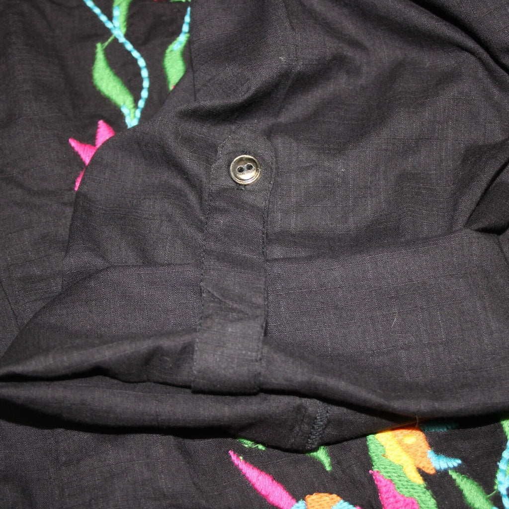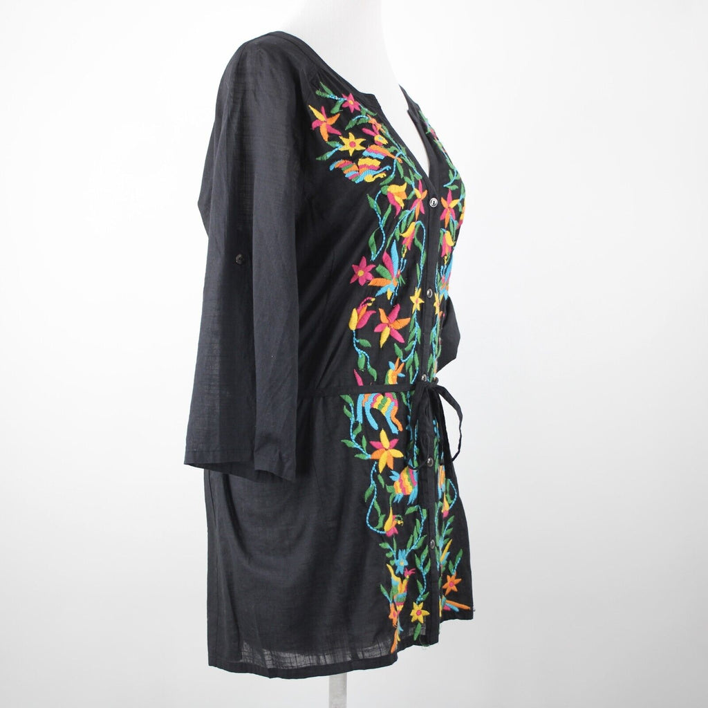 Double D Ranch Sz M Black Multi Embroidered V Neck Tab Sl Button 100% Cotton Top