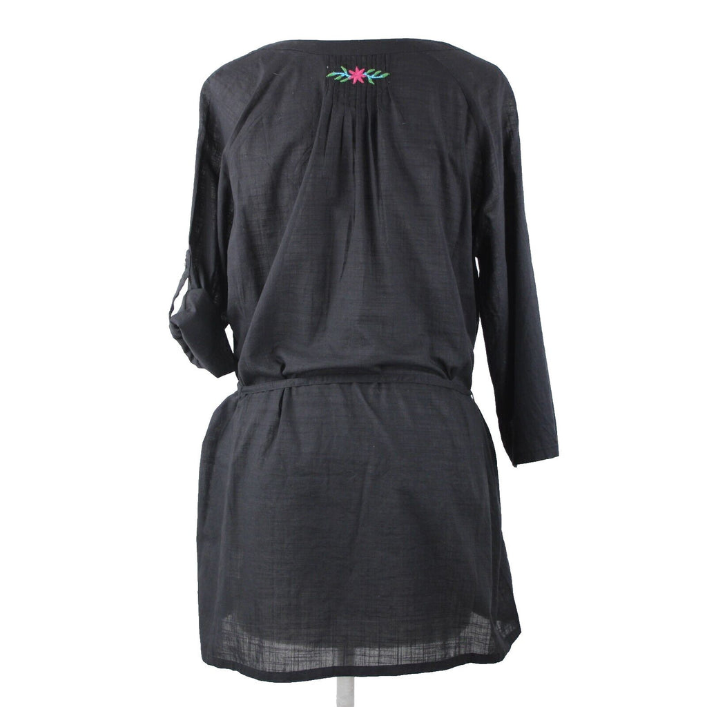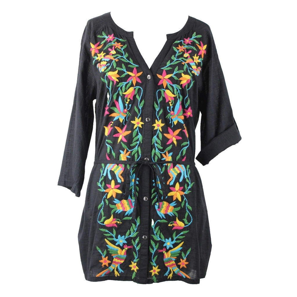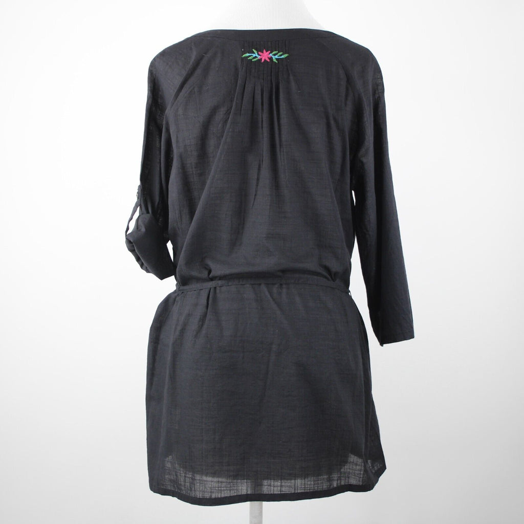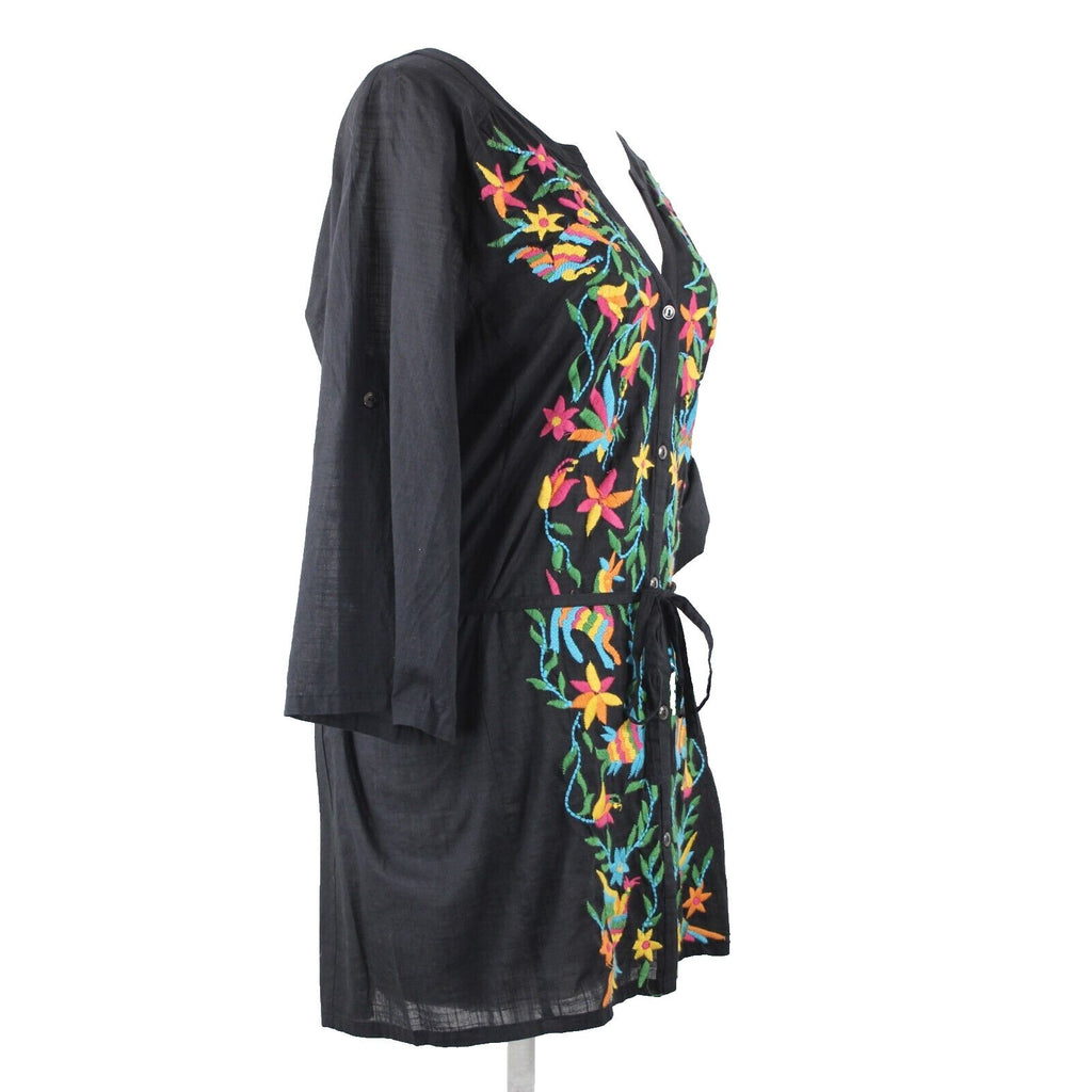 Double D Ranch Sz M Black Multi Embroidered V Neck Tab Sl Button 100% Cotton Top