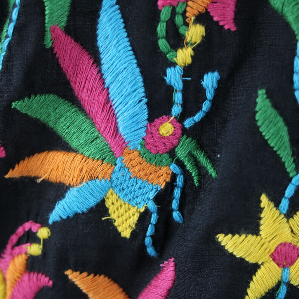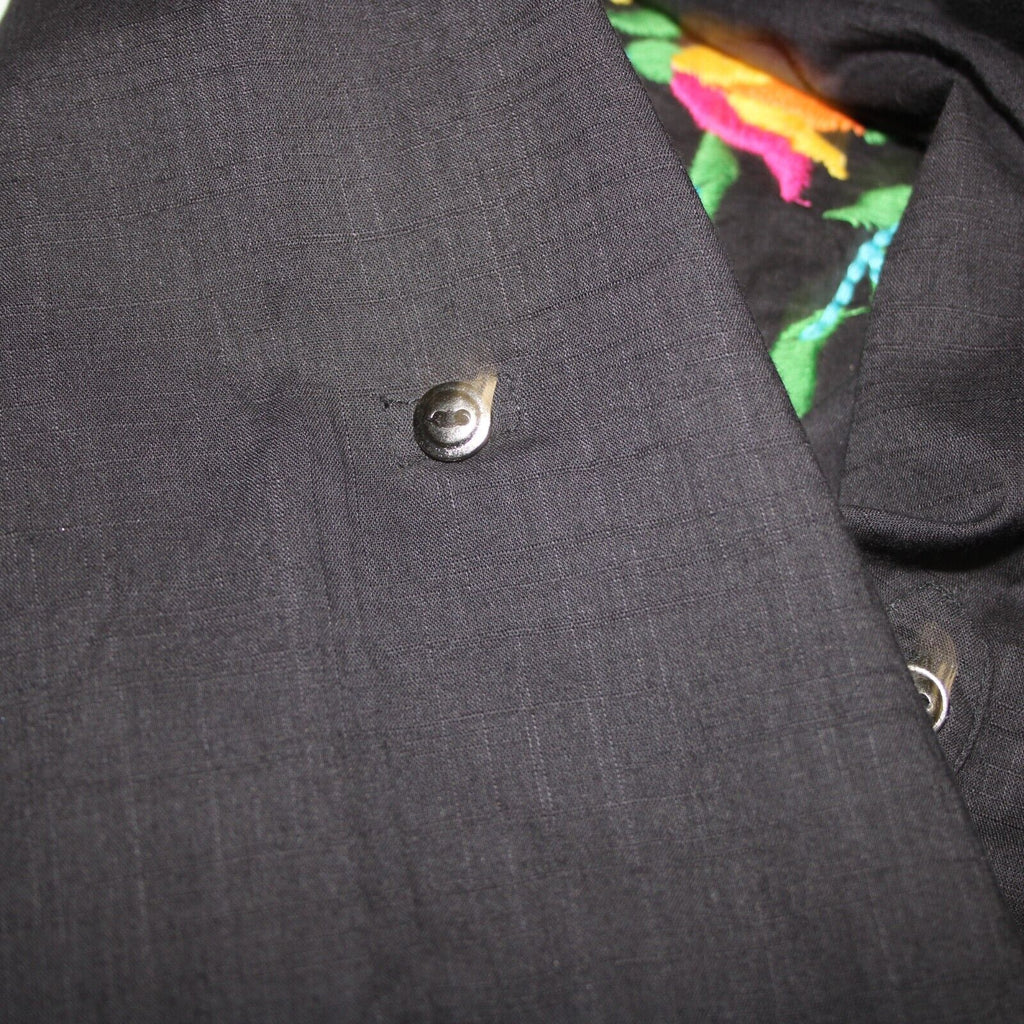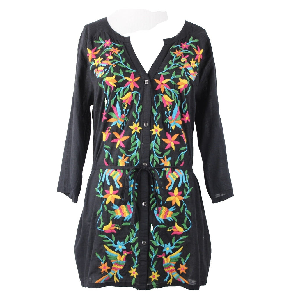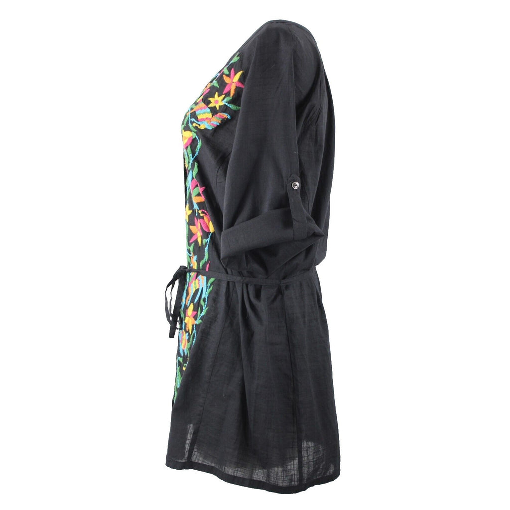 Double D Ranch Sz M Black Multi Embroidered V Neck Tab Sl Button 100% Cotton Top