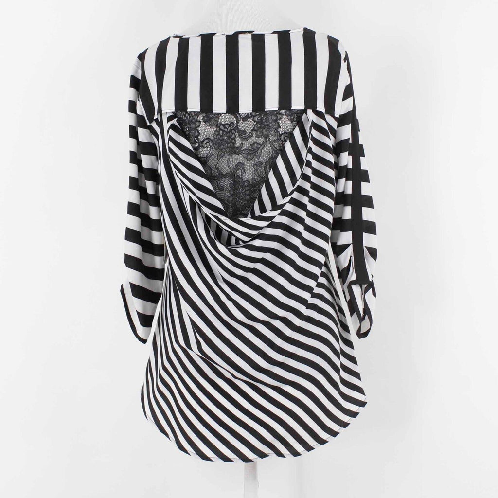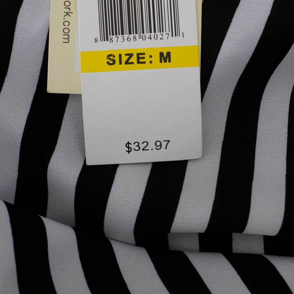 ECI NEW $33 Sz M Black White Stripe Hi Lo Lace Back Ruched Sleeve Woven Poly Top