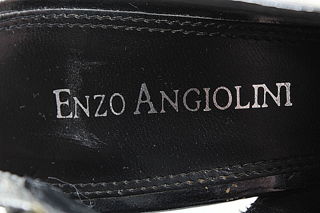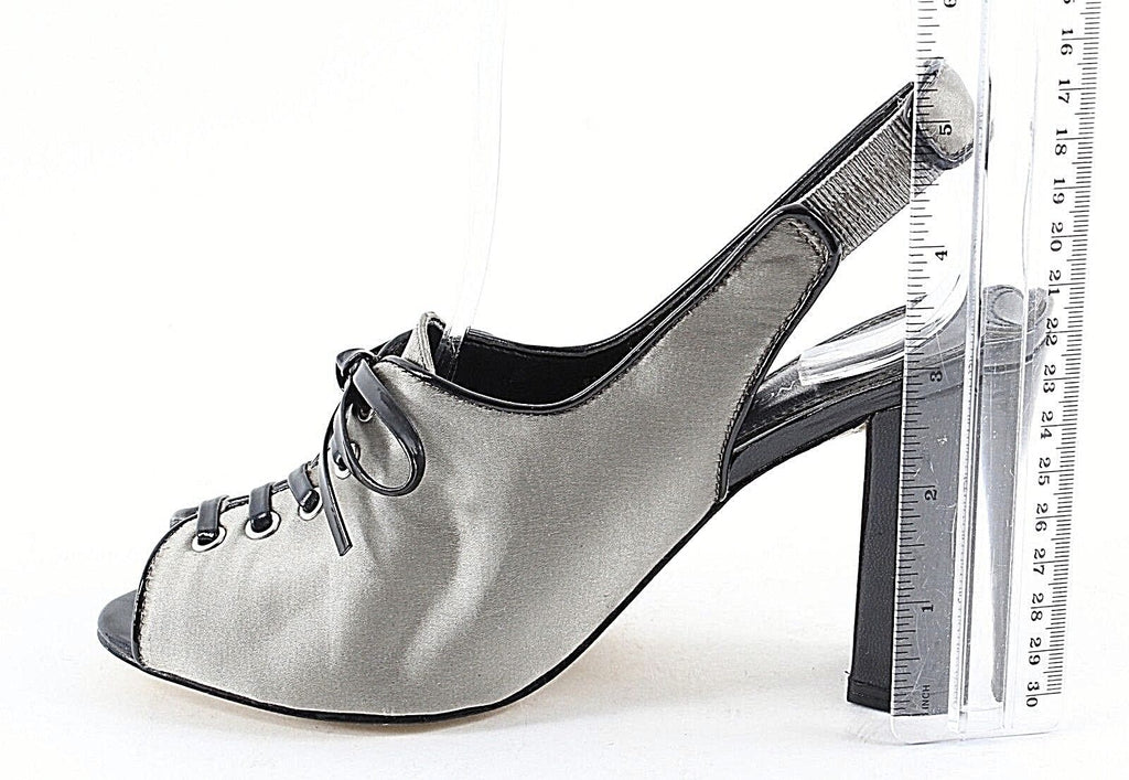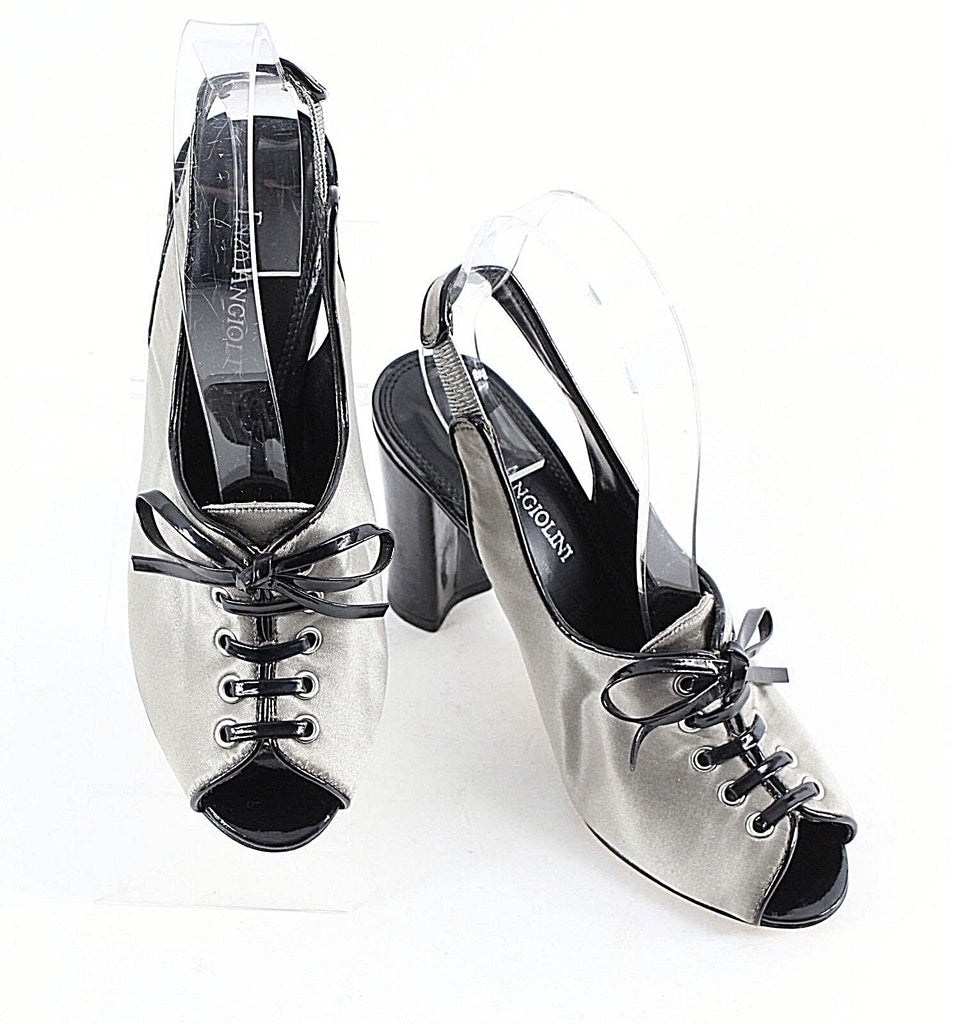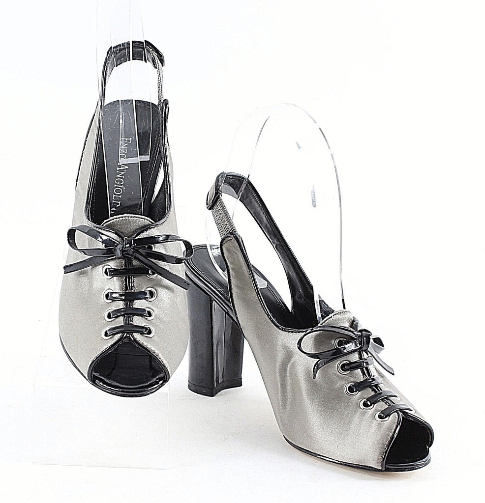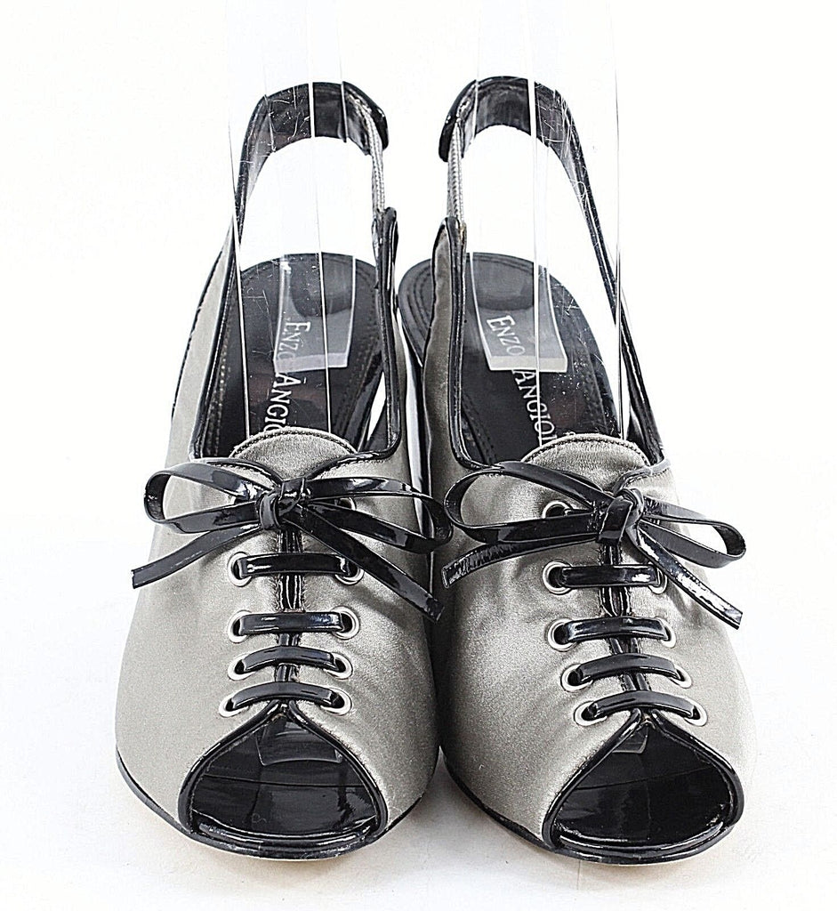 Enzo Angiolini 5M Silver Satin Black Patent Lace Up Open Toe Slingback Heel