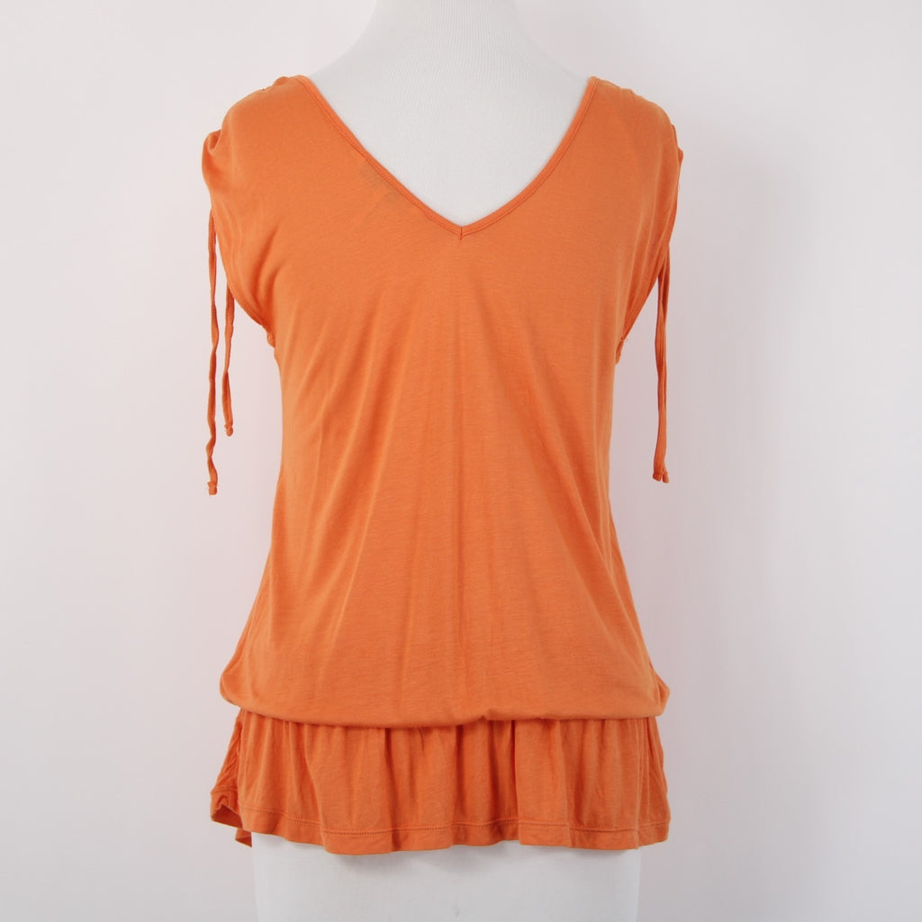 French Connection Top Sz XS Orange V Neck Ruffled Ruched Shoulder 100% Rayon Top
