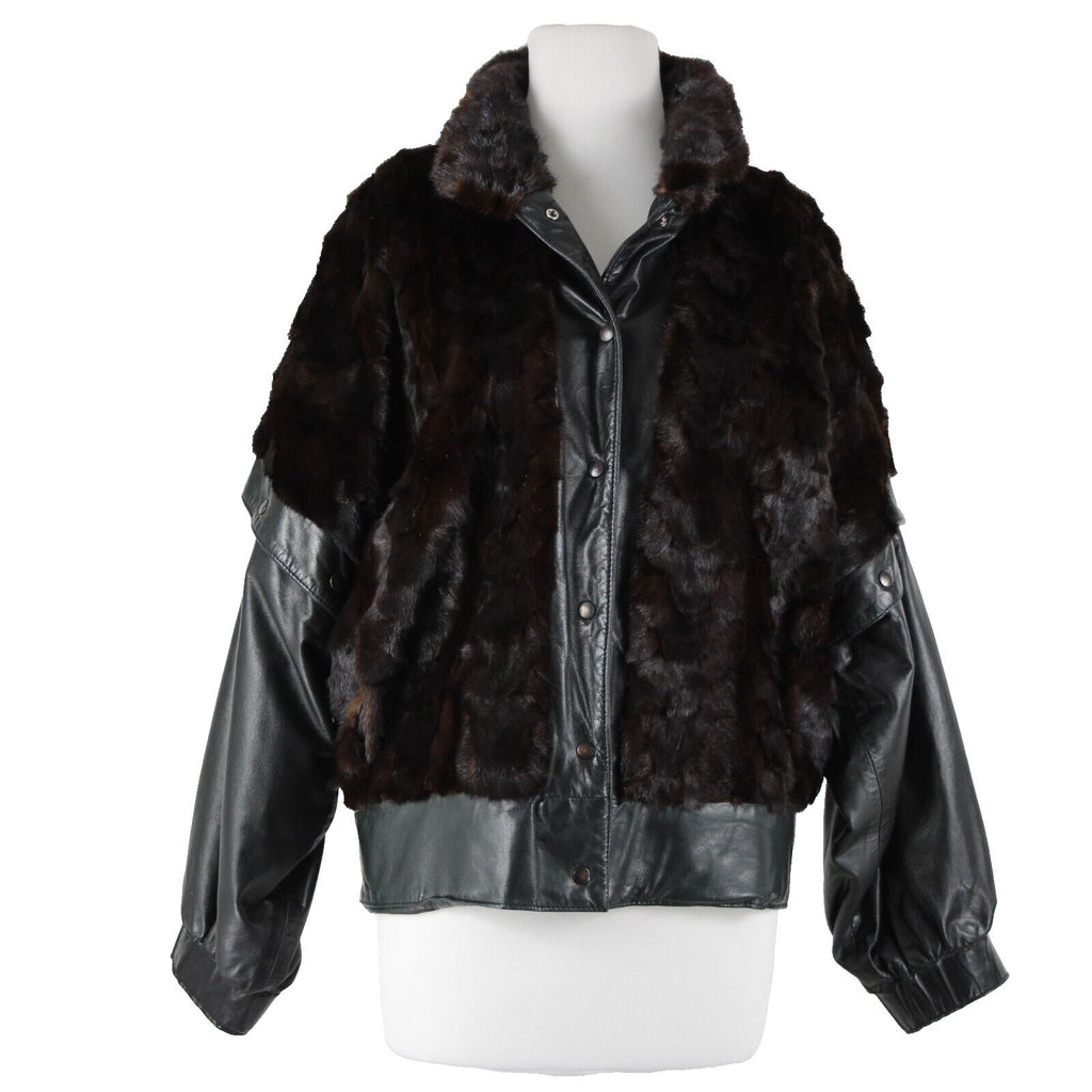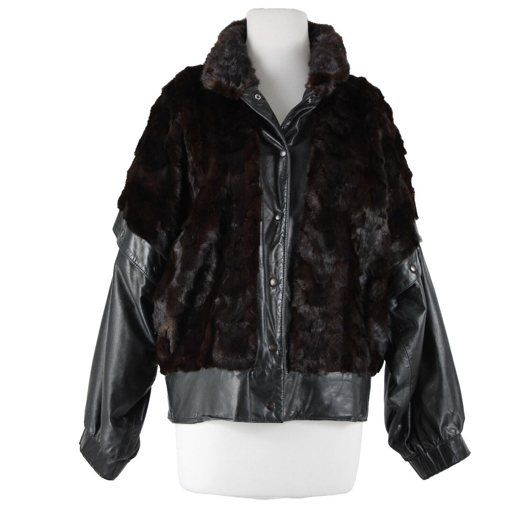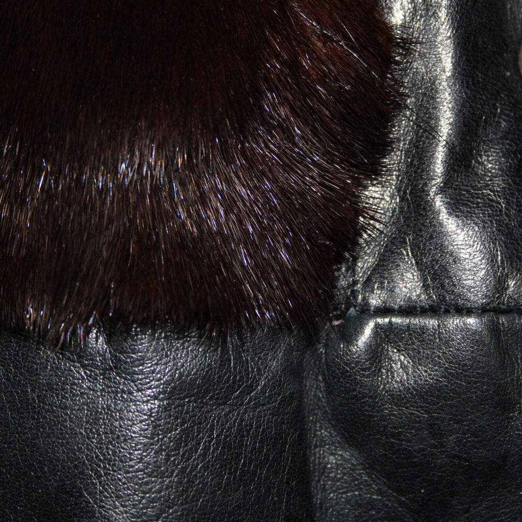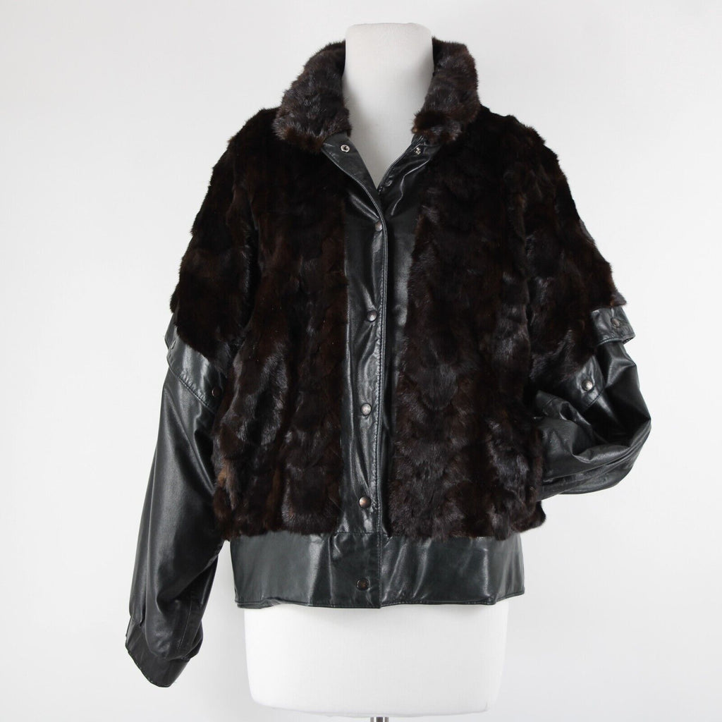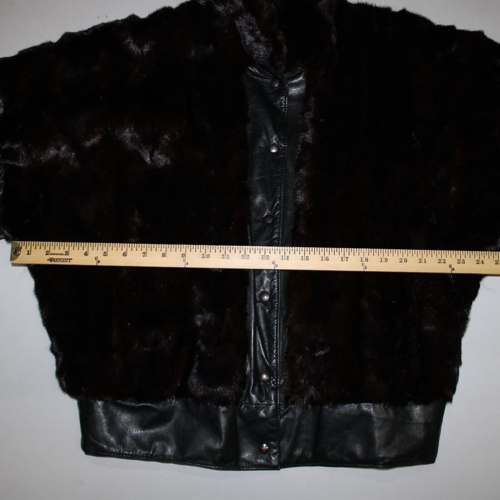 Goldwaters Sz L Black Brown Mink Fur Snap Off Sleeves Button VTG Leather Jacket