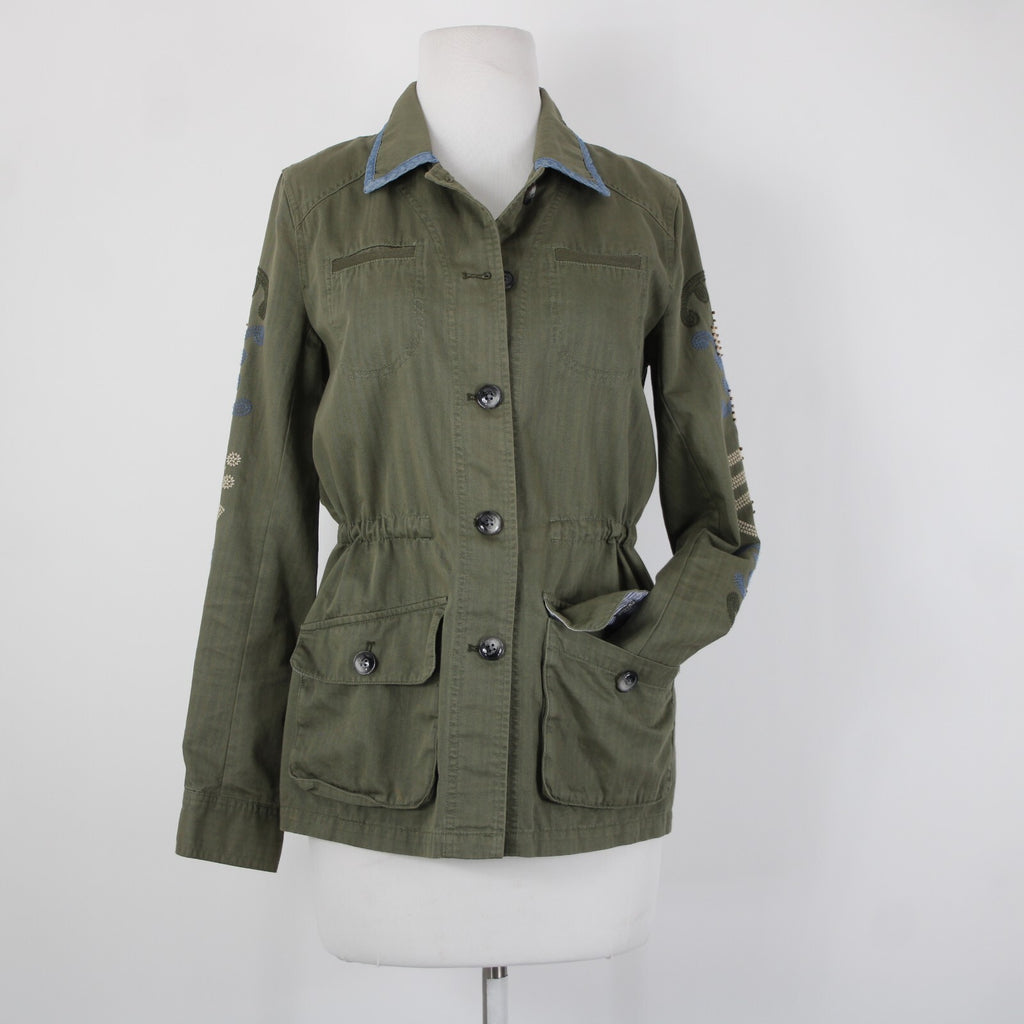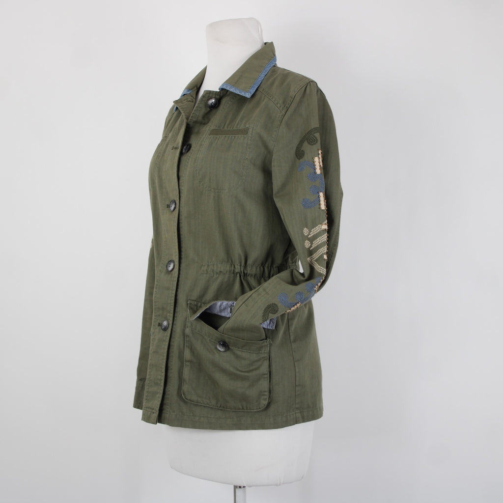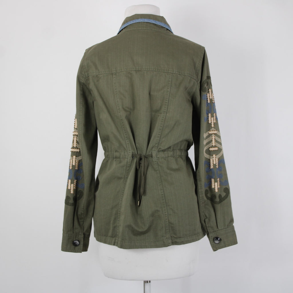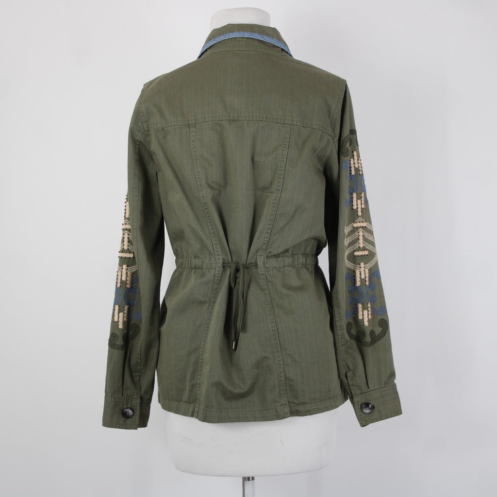 Hei Hei Sz XS Olive Green Blue Trim Embroidered Tie Back Cotton Pockets Jacket