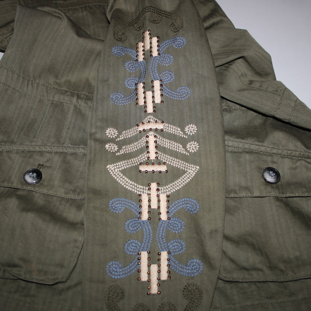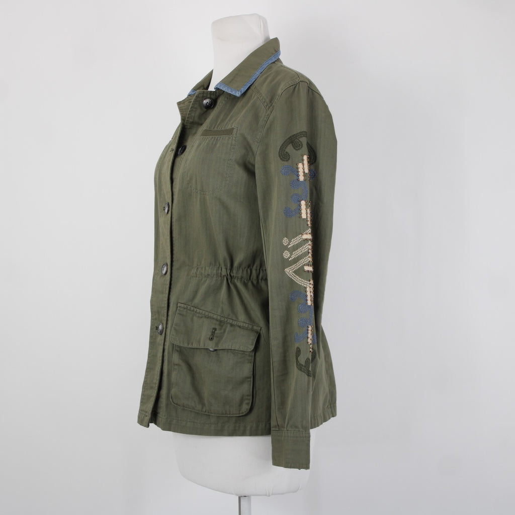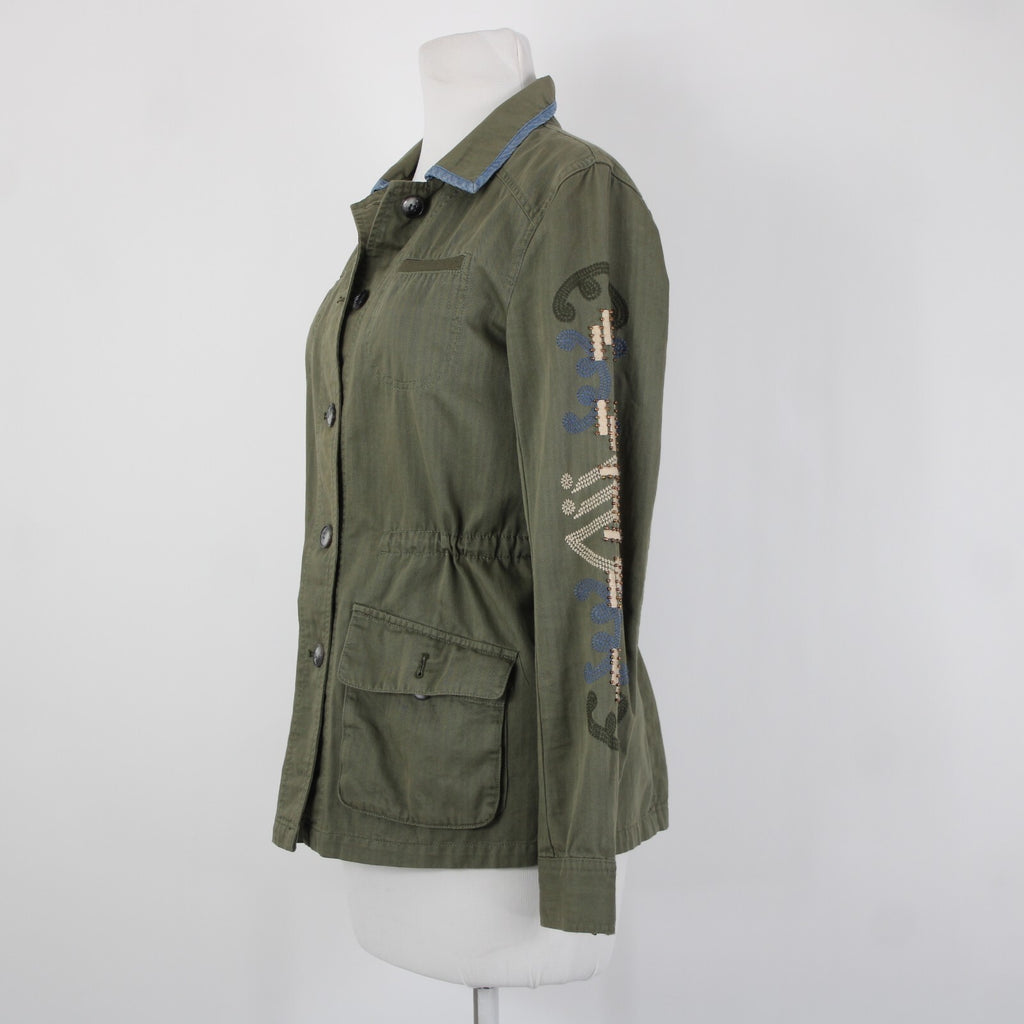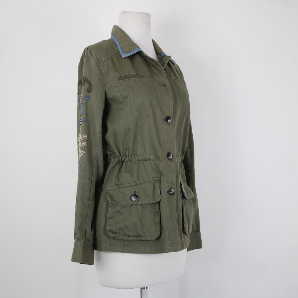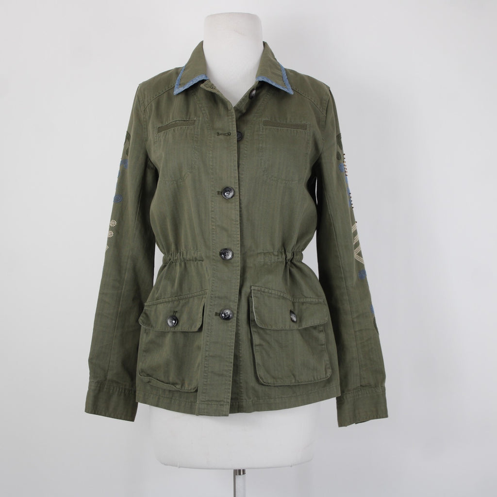 Hei Hei Sz XS Olive Green Blue Trim Embroidered Tie Back Cotton Pockets Jacket