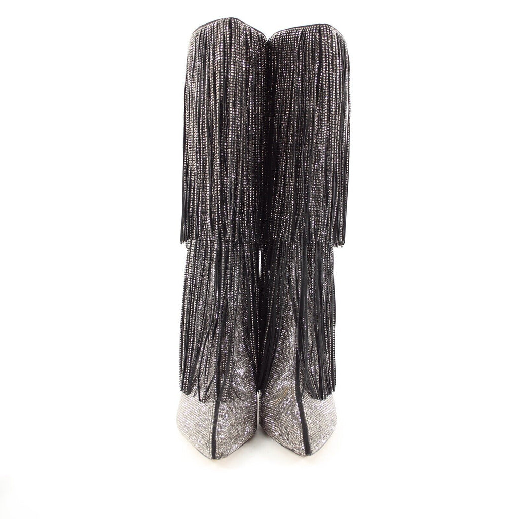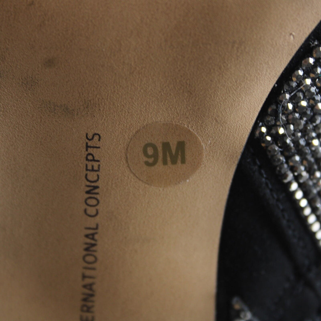 INC Ishani Sz 9M Black Silver Rhinestones Fringe Man Made Fabric 3.5" Calf Boot