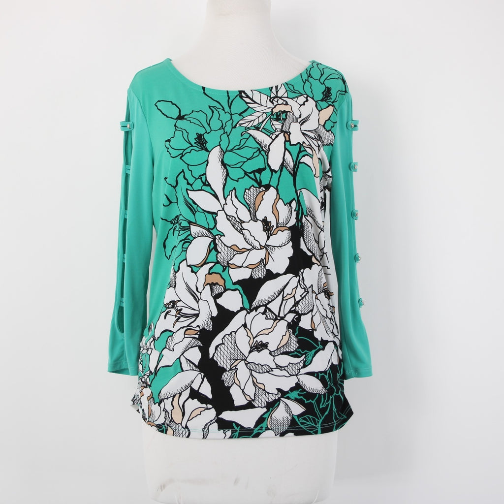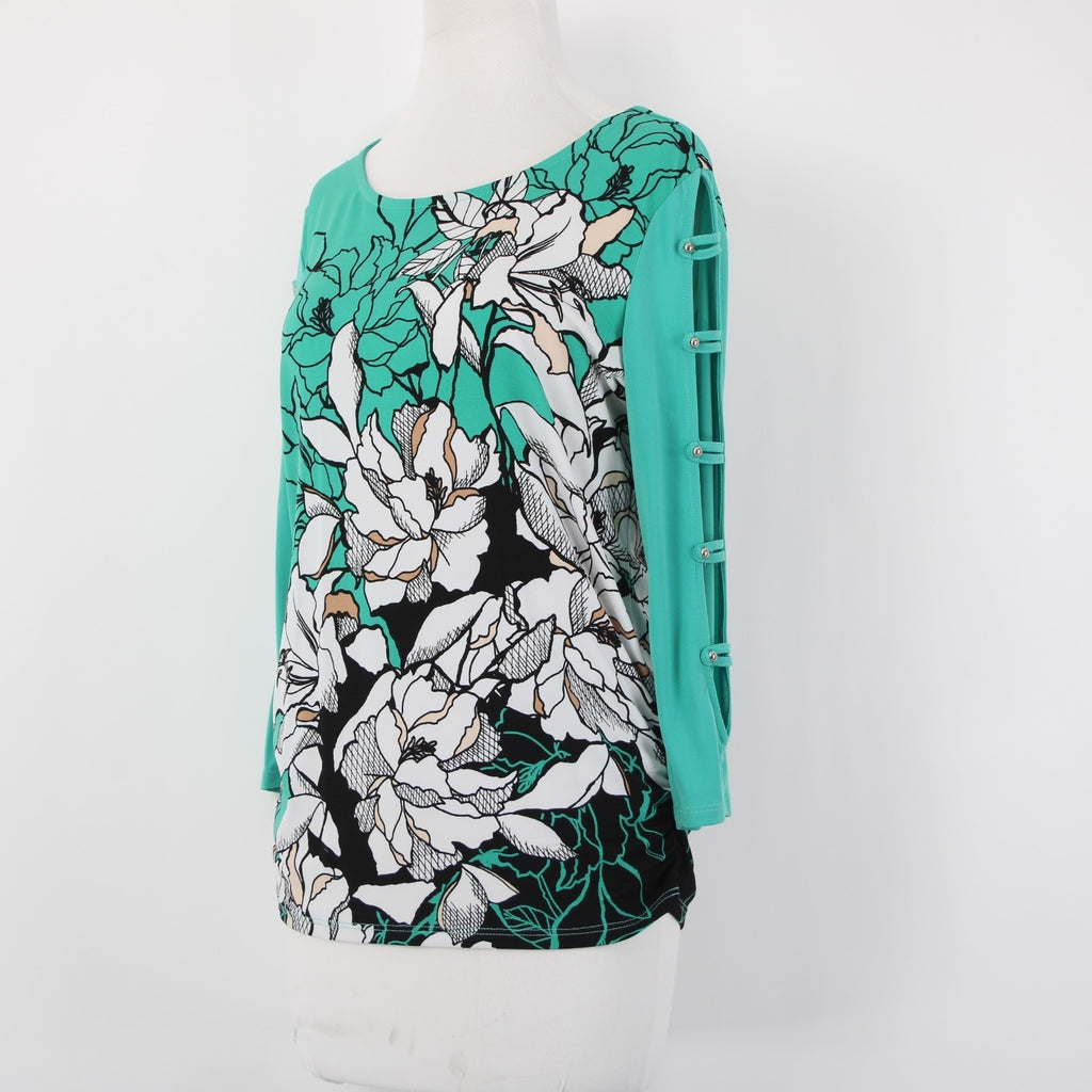 JM Collection Top Sz S Green Black White Multi Color Floral Poly Spandex Top