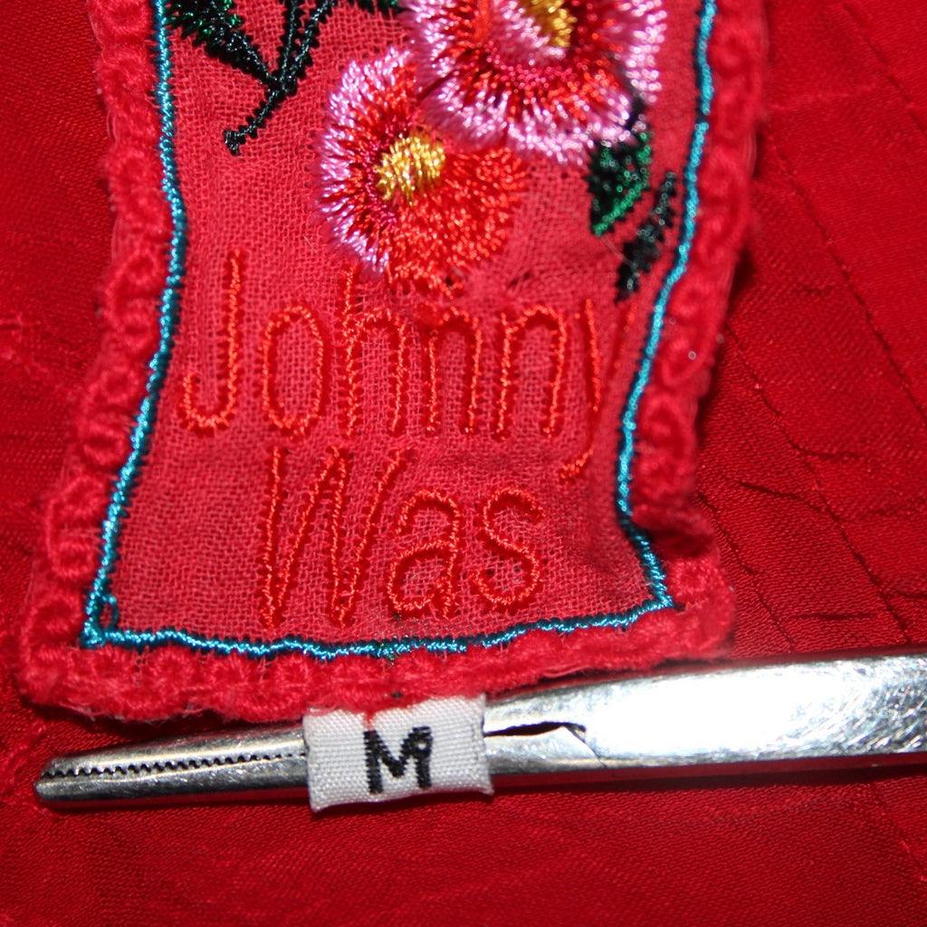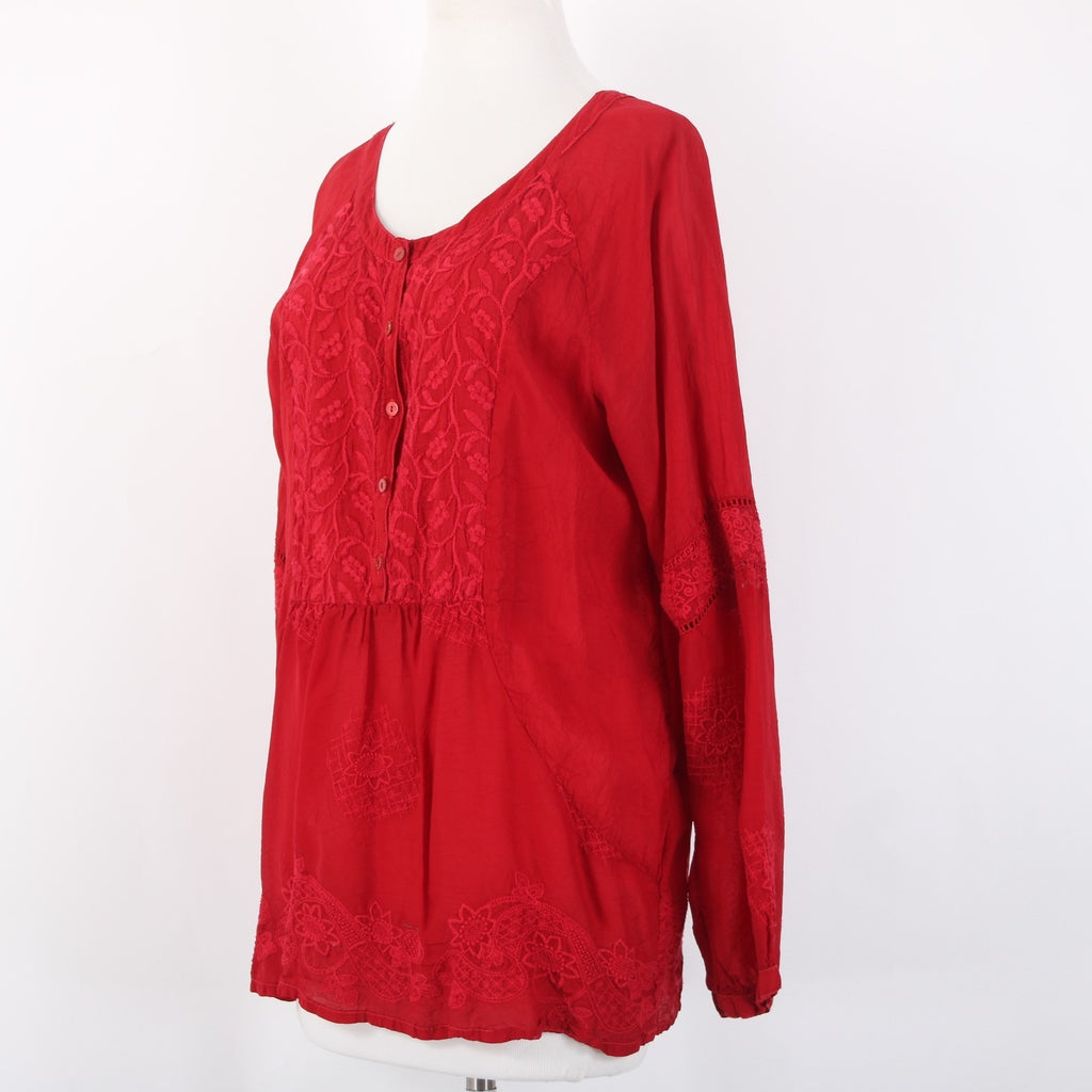 Johnny Was Top Sz M Red Embroidered Sheer Half Buttons 100% Cupio Rayon Top