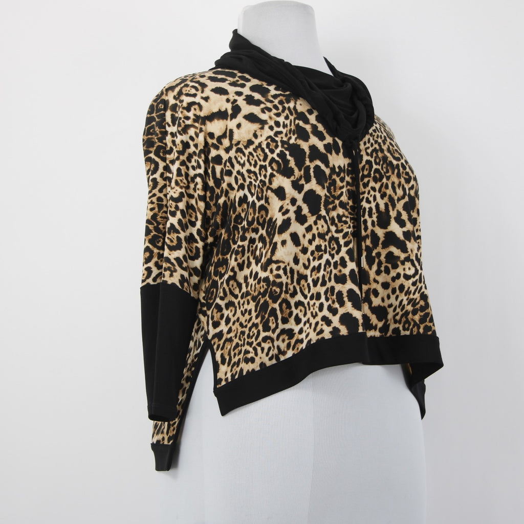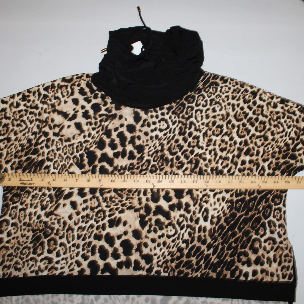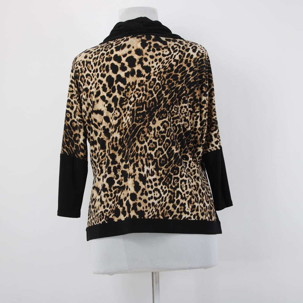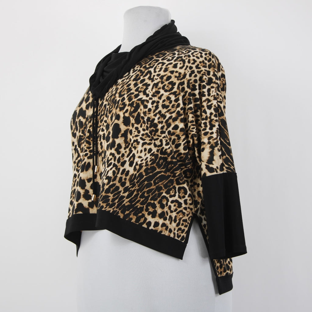 Joseph Ribkoff Top Sz 16 Black Brown Animal Prnt Drawstring Neck Hi Low Poly Top