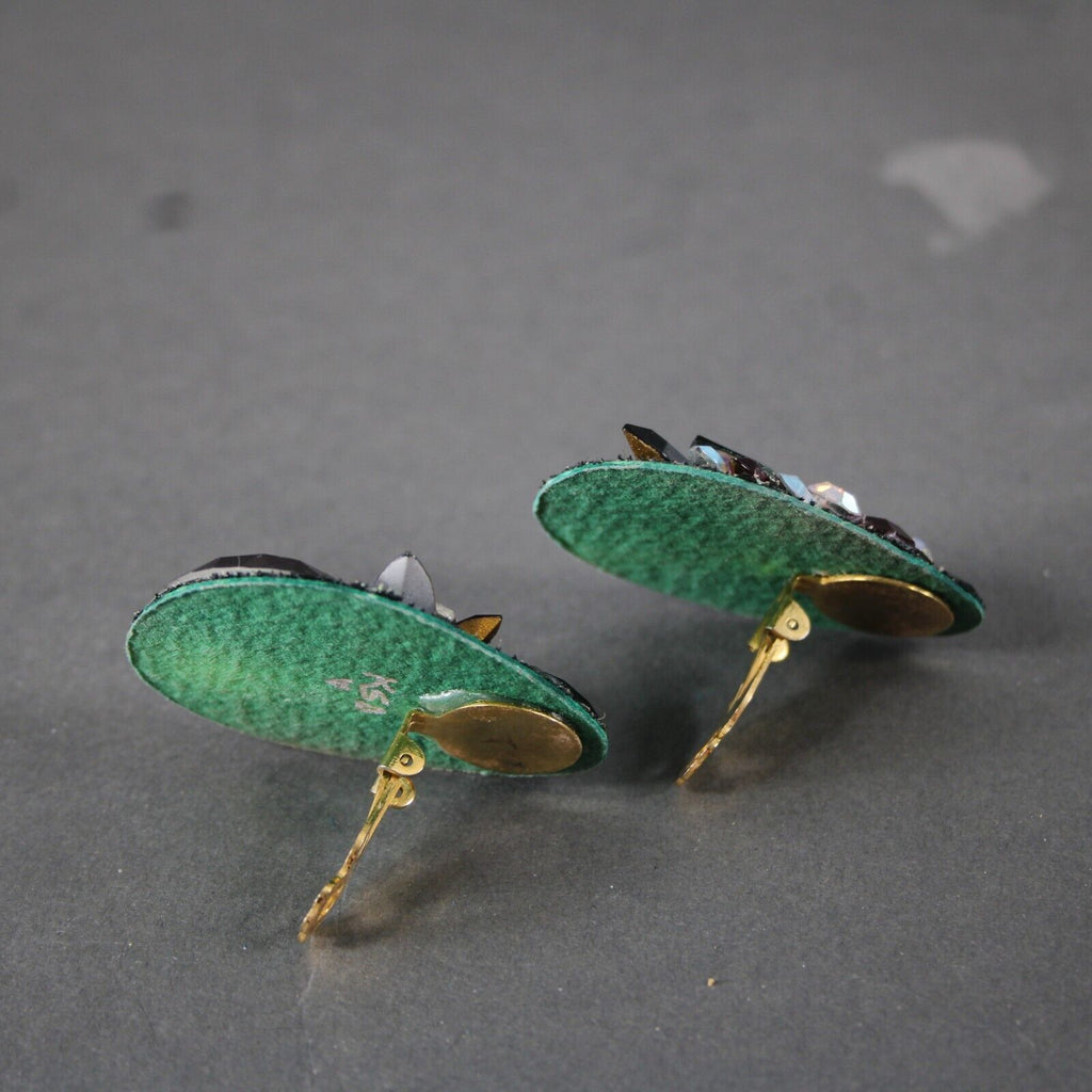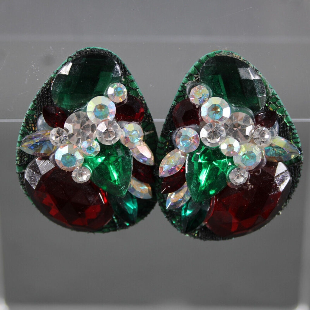KSD VTG Green Red Black AB Rhinestones Rectangular 2" Clip On Earrings
