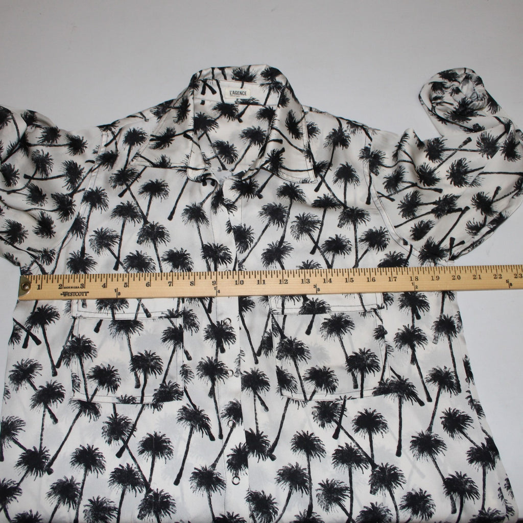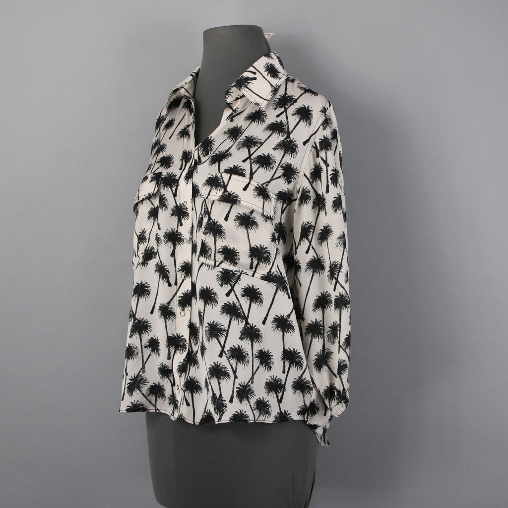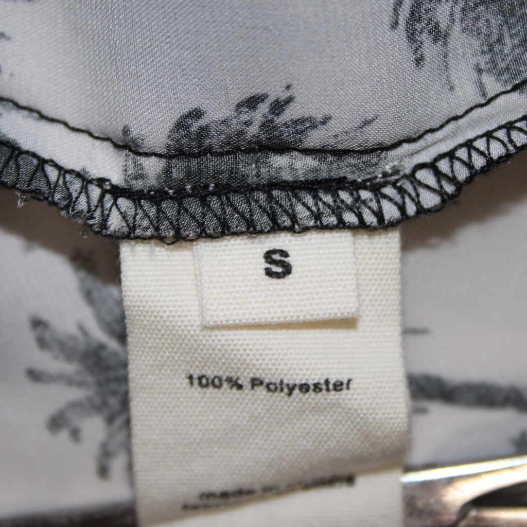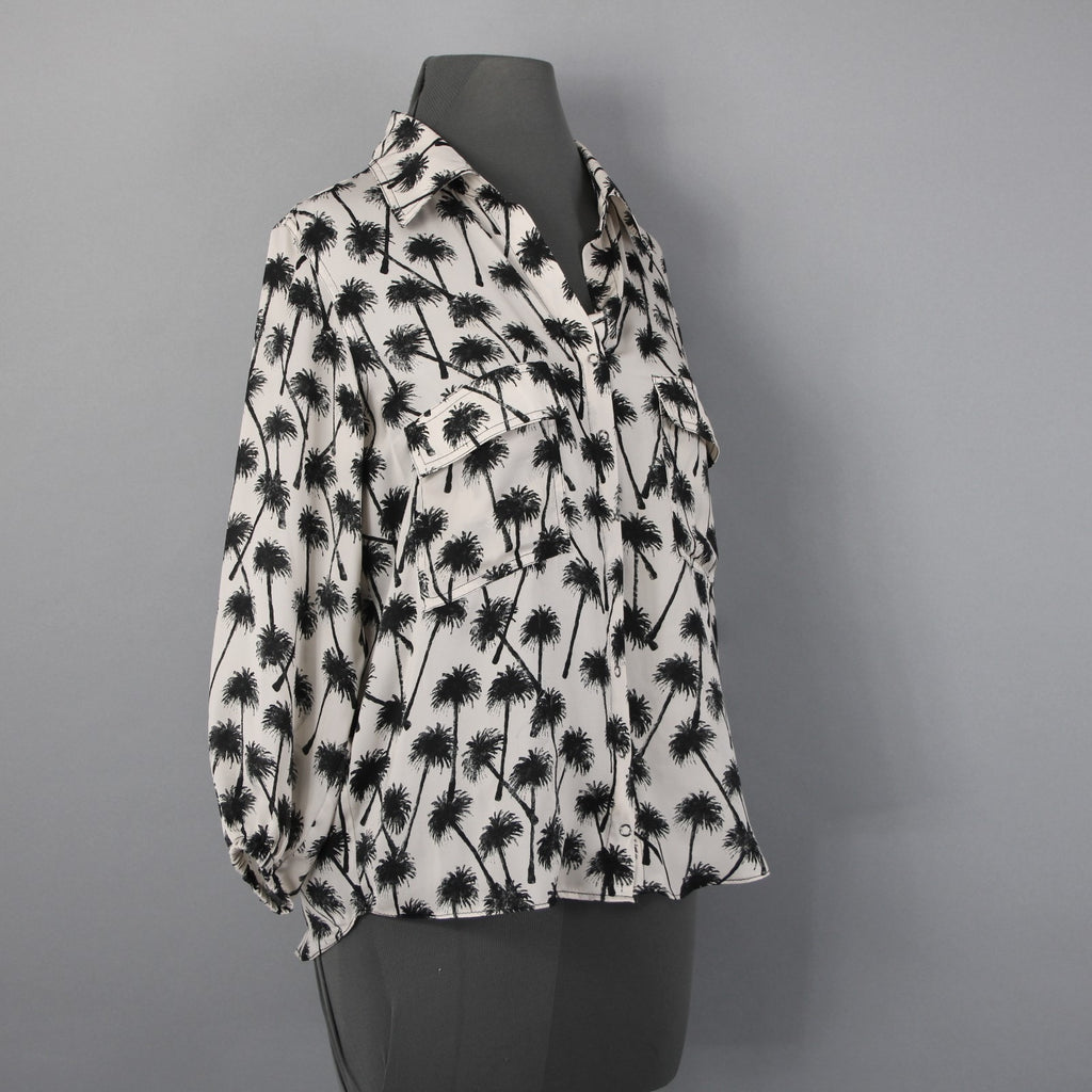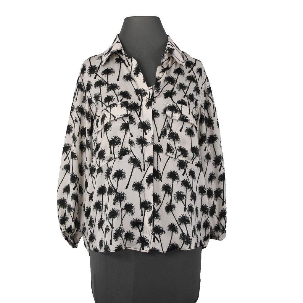 La'Gence Top Sz S Gray Black Palm Trees Collared Buttons 100% Polyester Top
