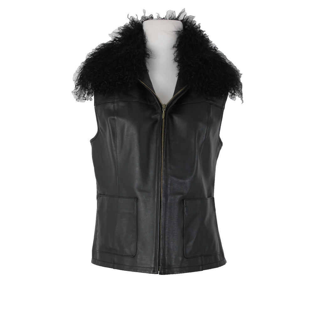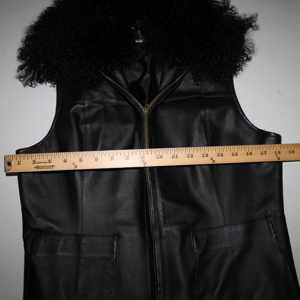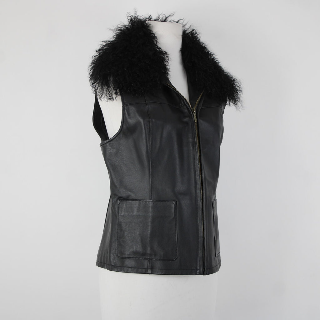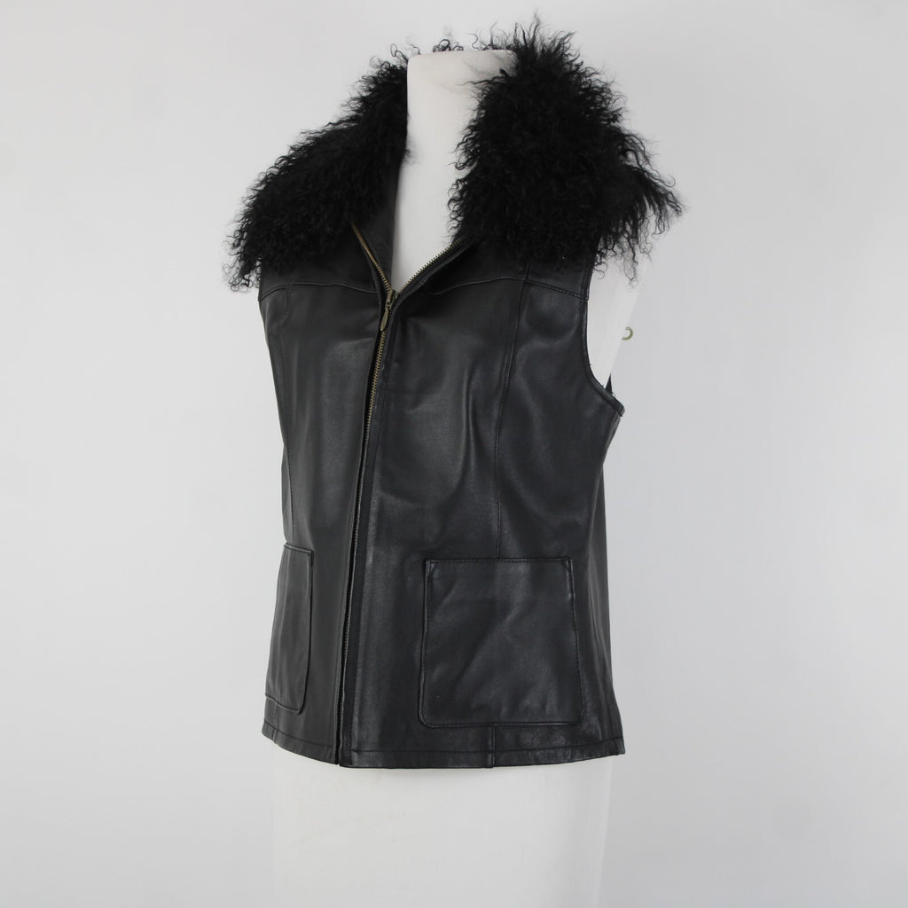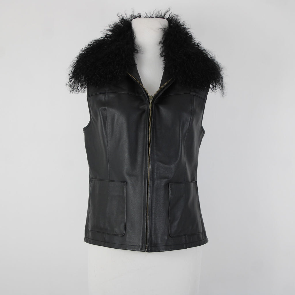 Lisa International Sz M Black Removable Fur Collar Pockets 100% Leather Vest