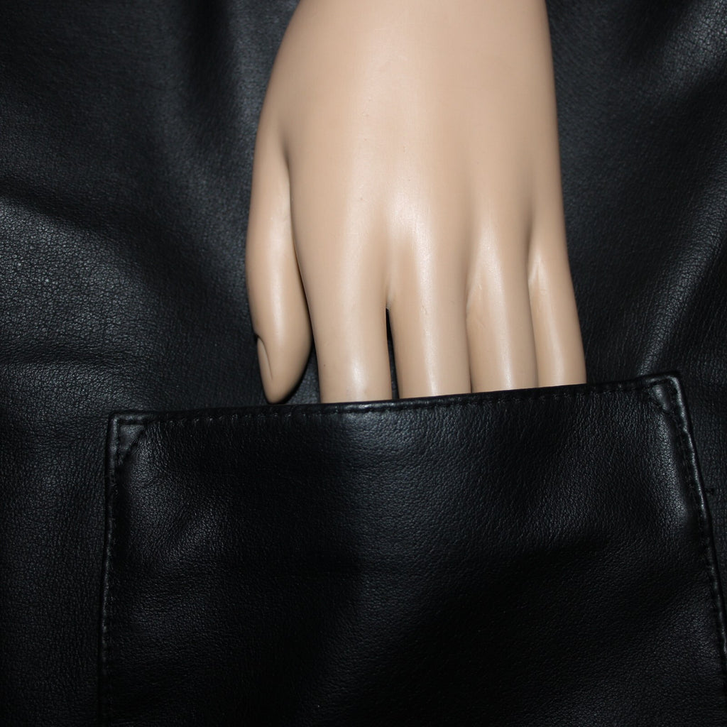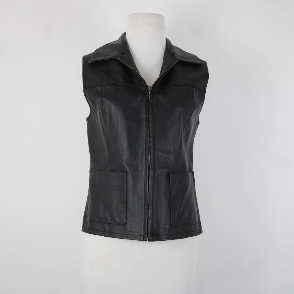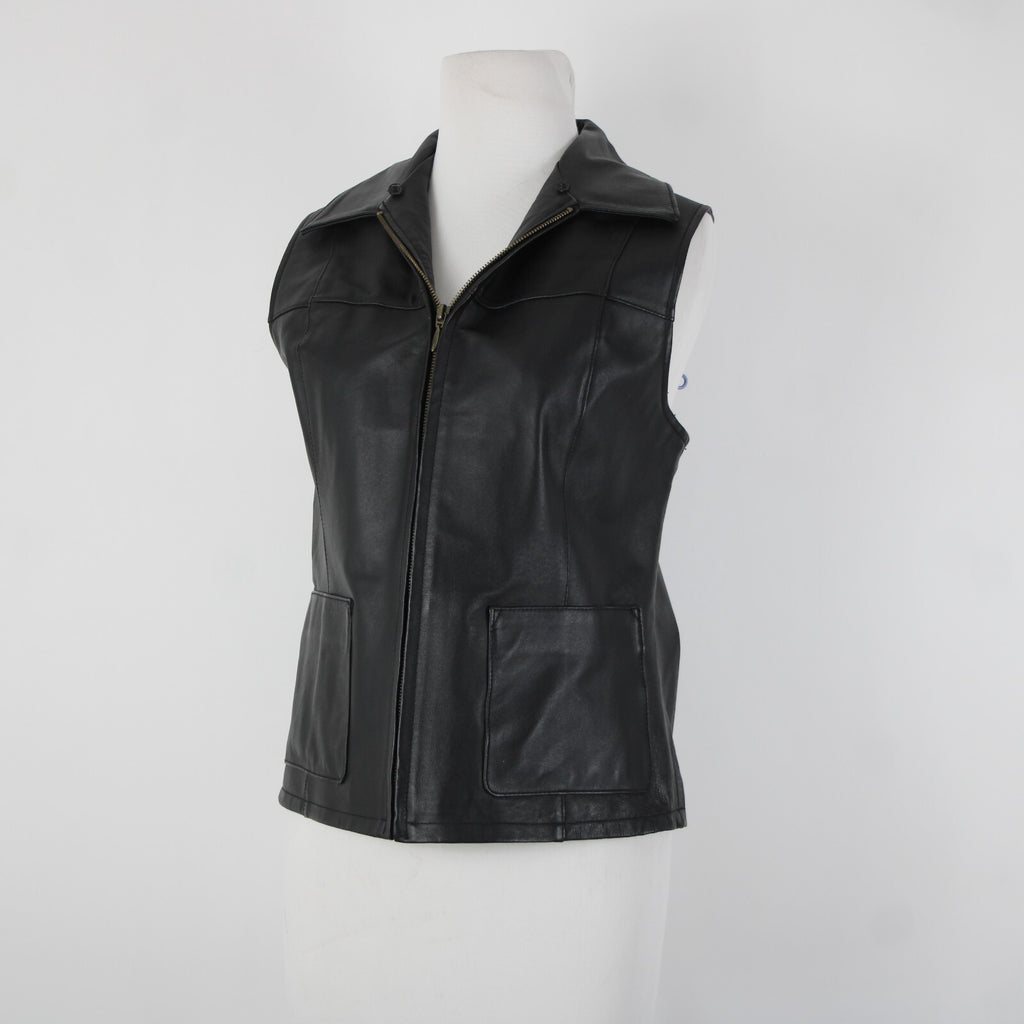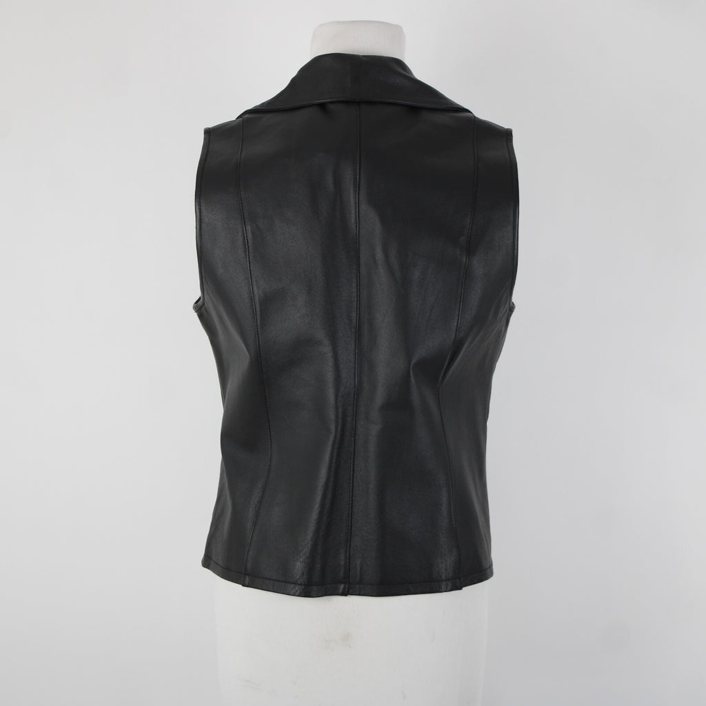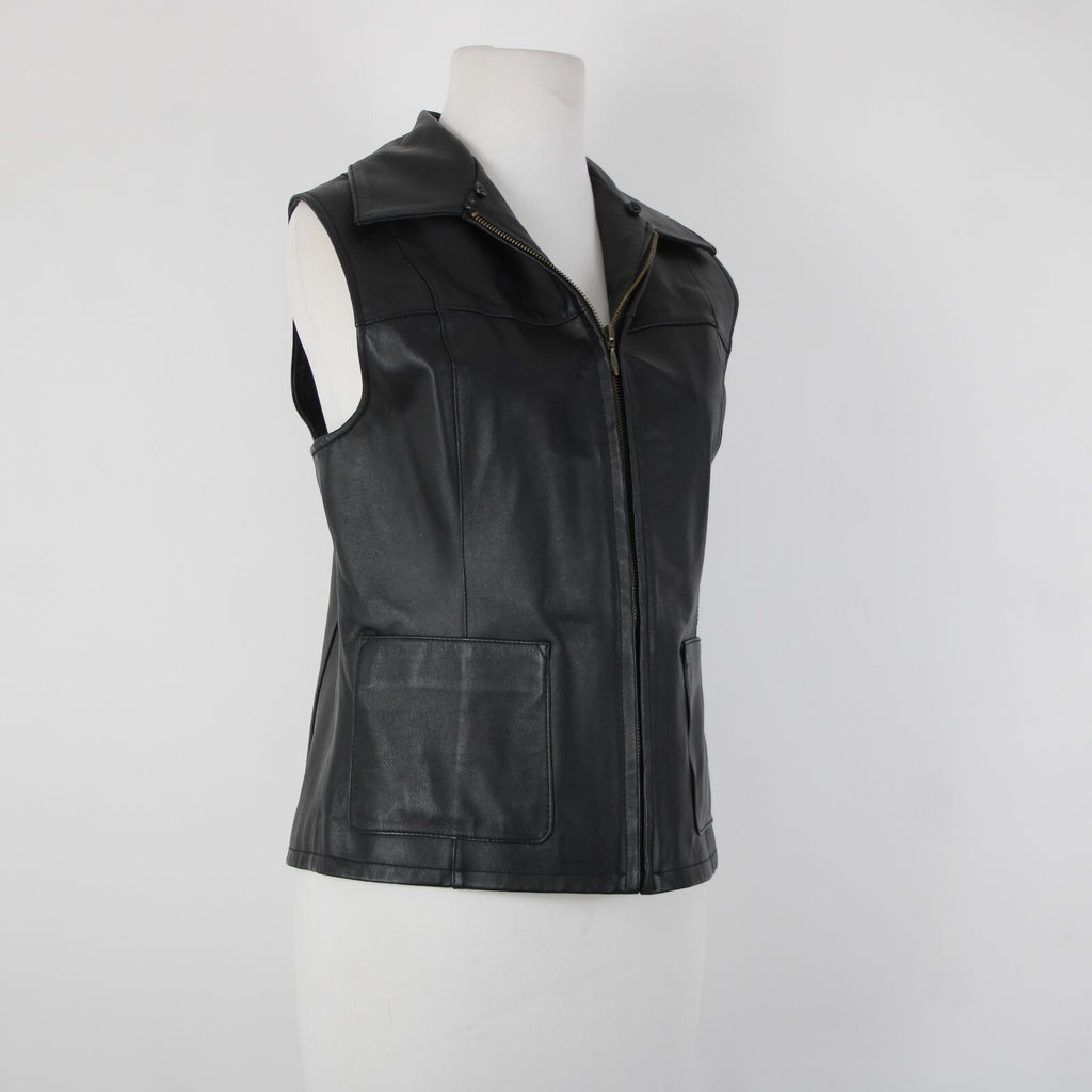 Lisa International Sz M Black Removable Fur Collar Pockets 100% Leather Vest