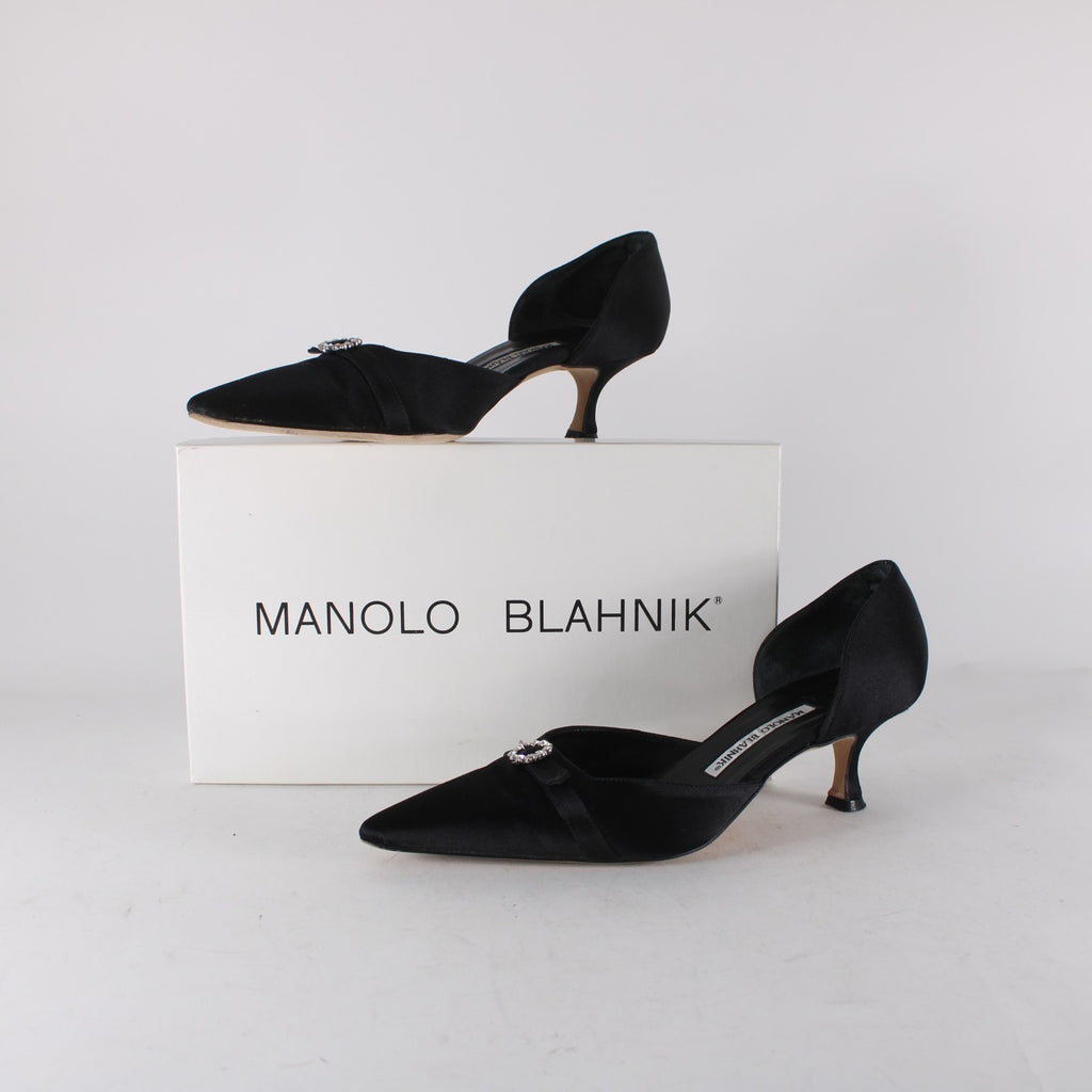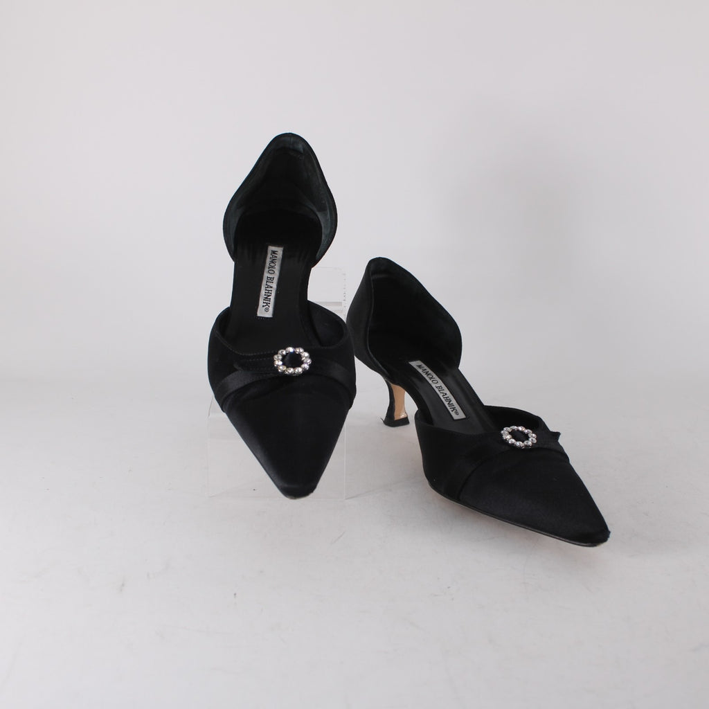 Manolo Blahnik Heels Floran Sz 38 Black Rhinestones Satin Leather Kitten 1.5"