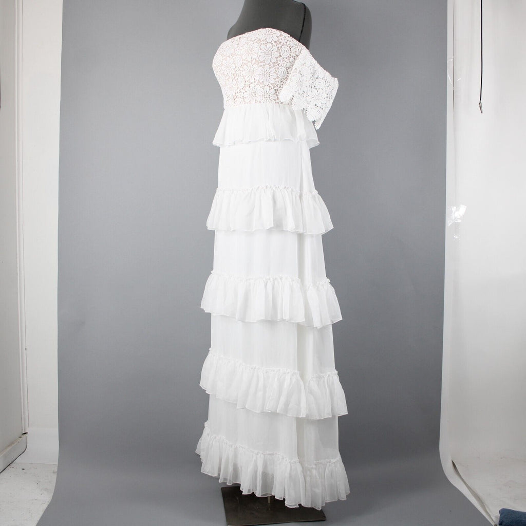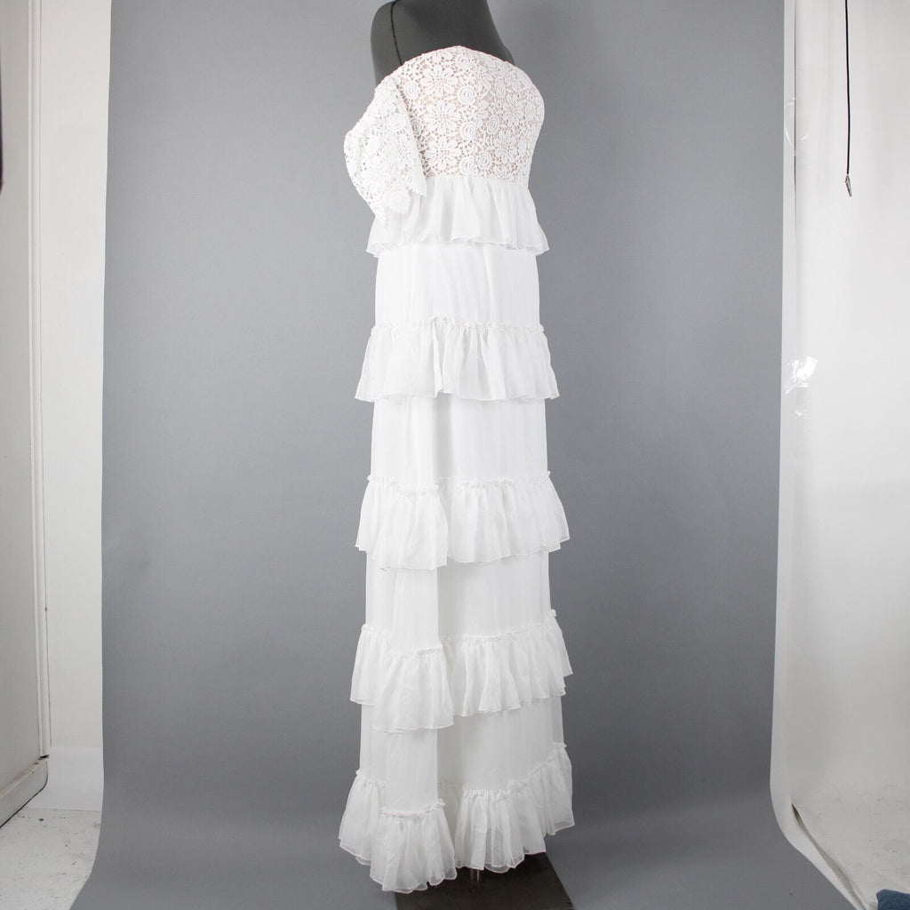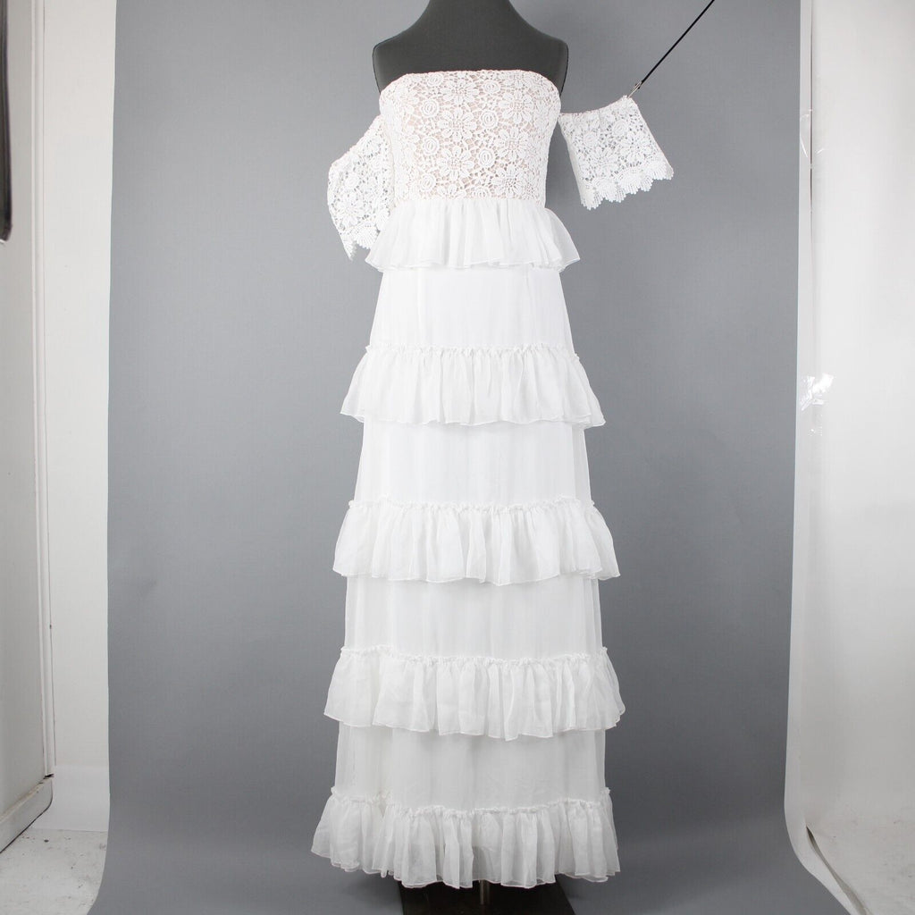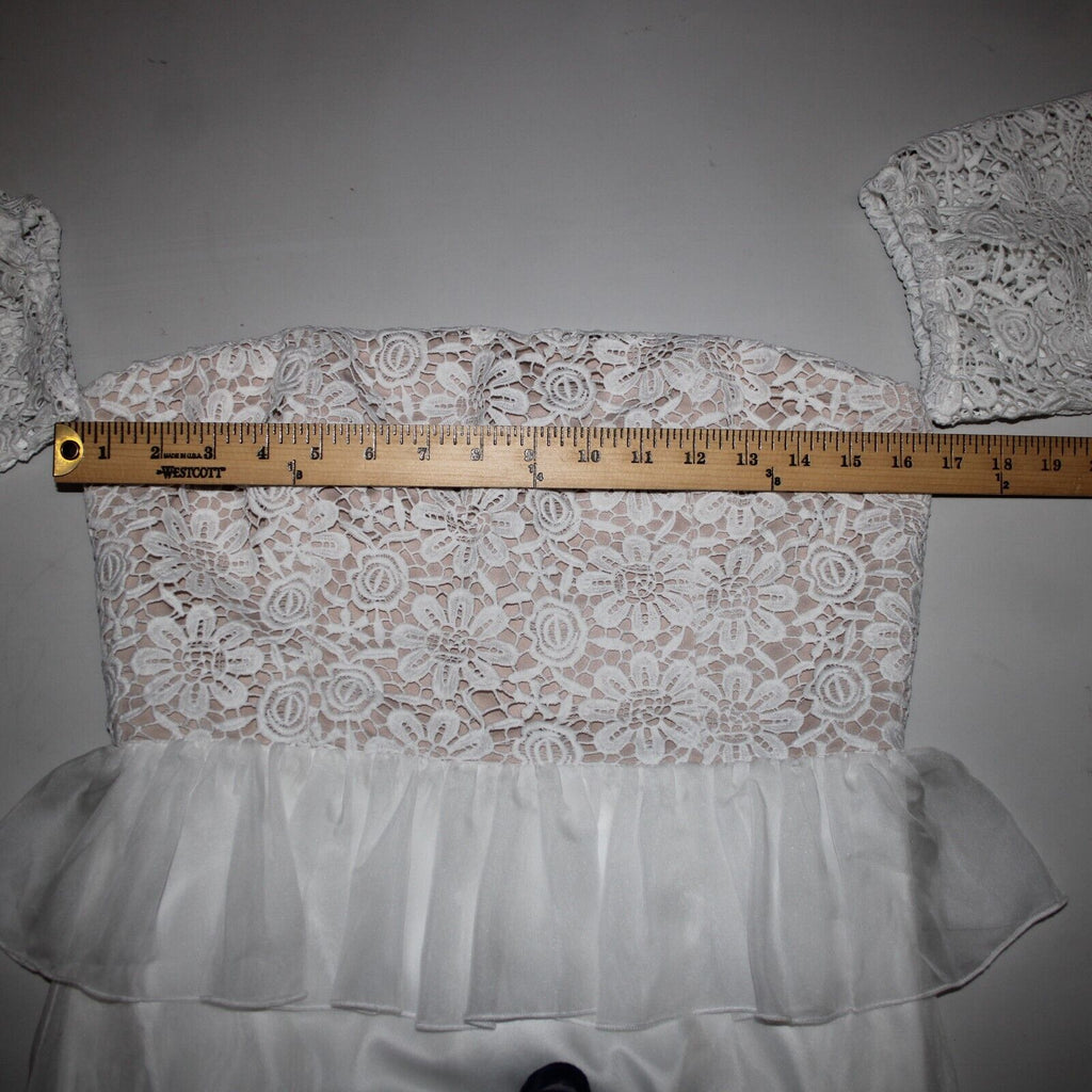 Minuet NEW Sz L White Tan Lined Lacoe Ruffles Off Shoulders Polyester Dress