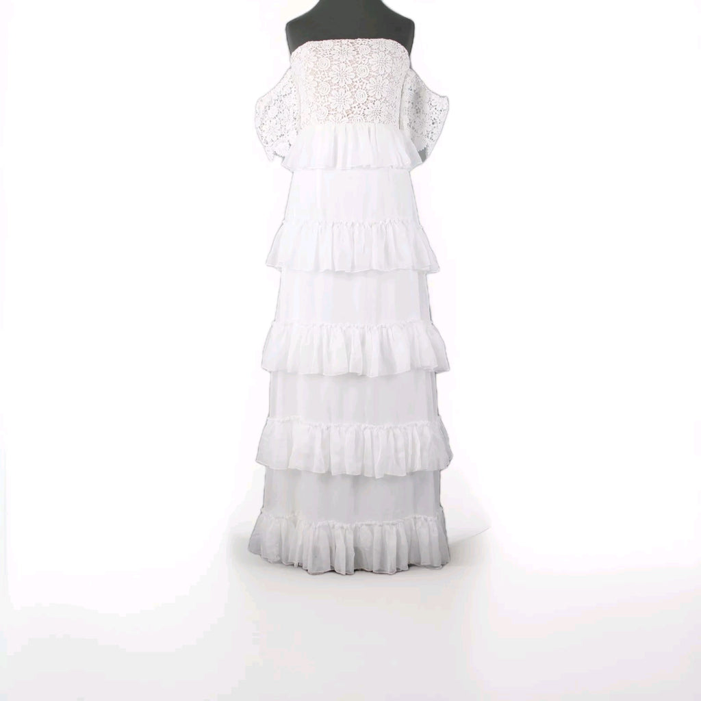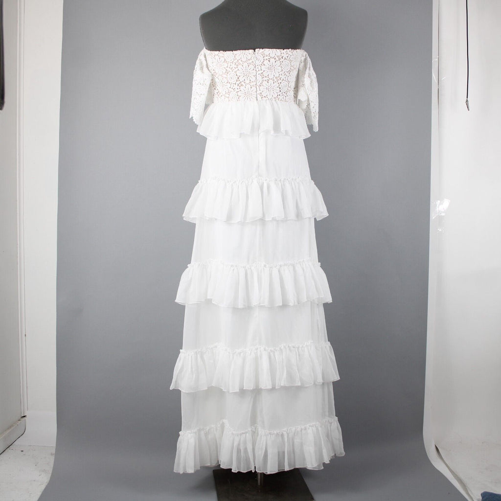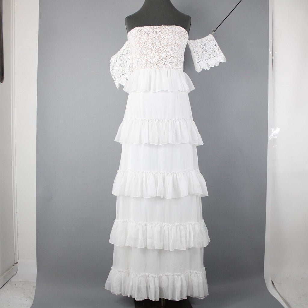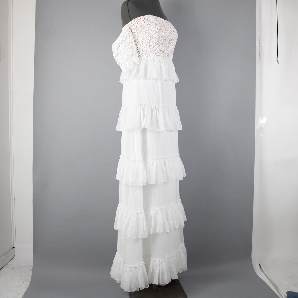 Minuet NEW Sz L White Tan Lined Lacoe Ruffles Off Shoulders Polyester Dress