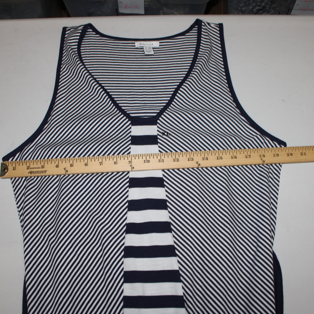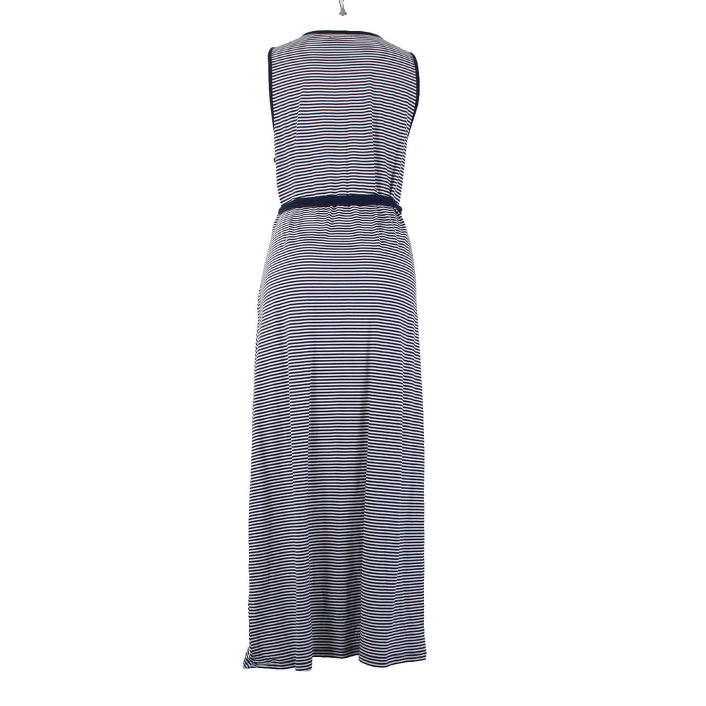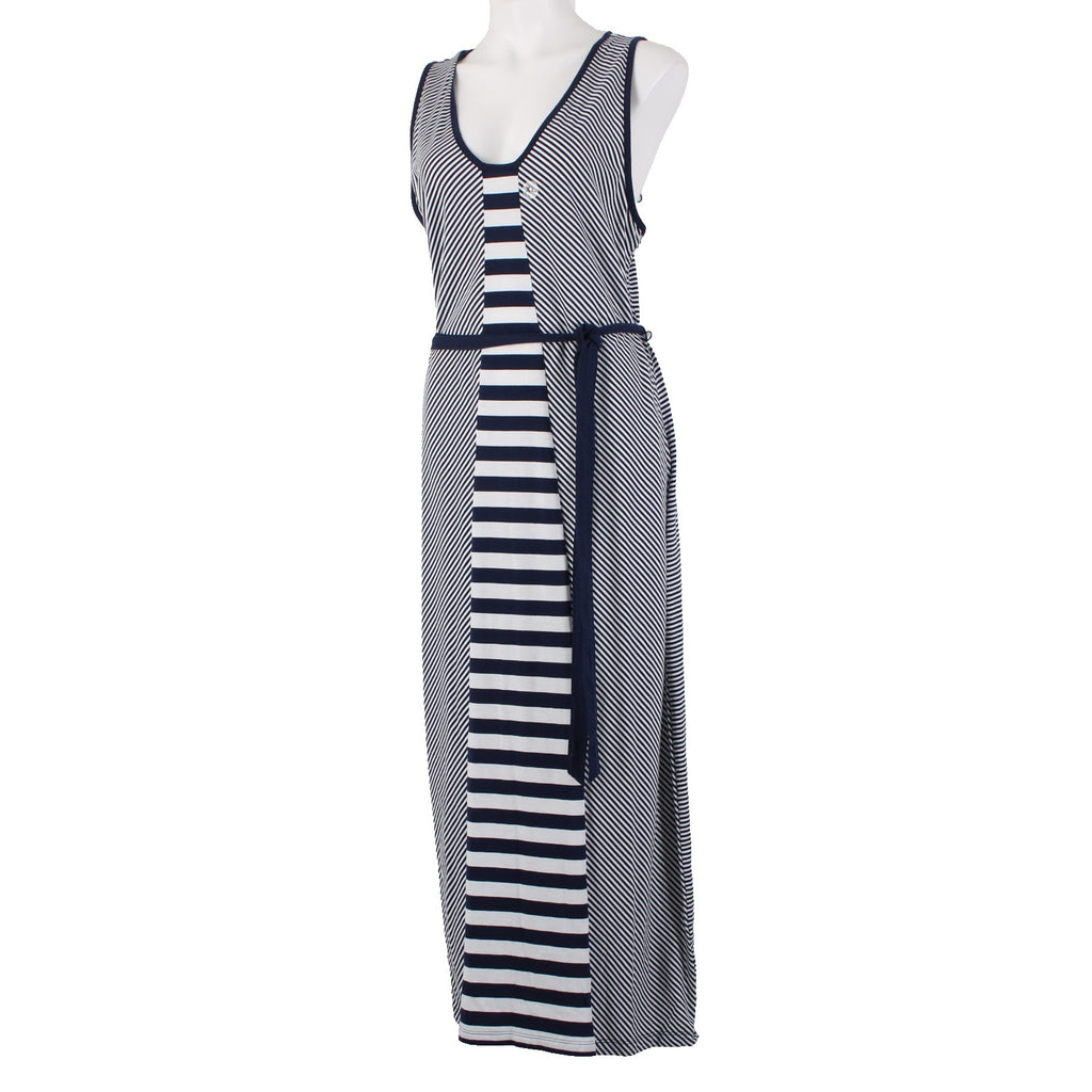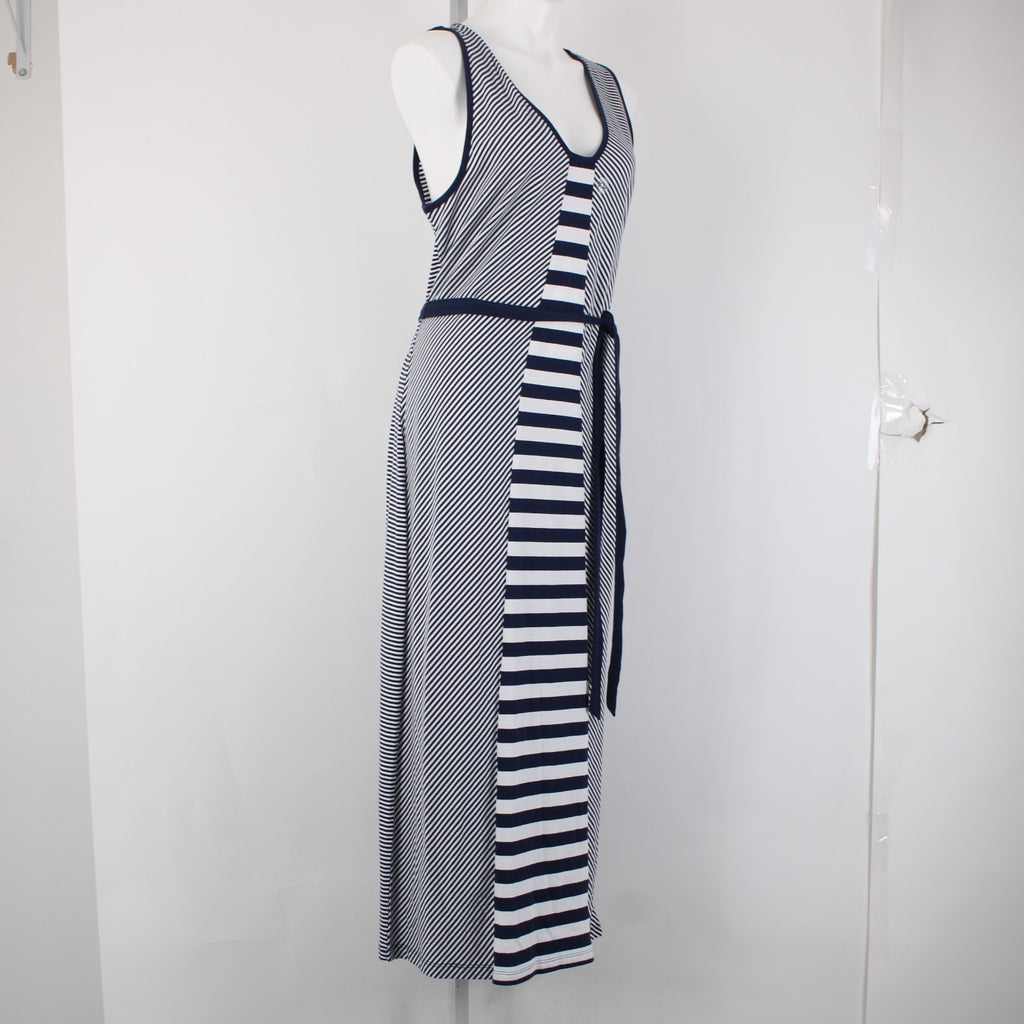 Nautica Dress Sz XL Navy Blue White Striped With Belt V Neck Maxi Cotton Dress