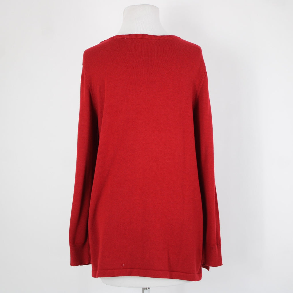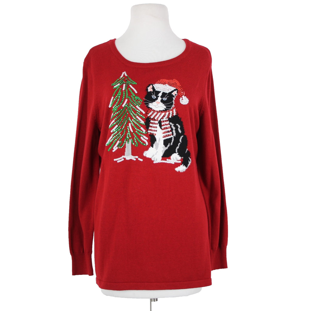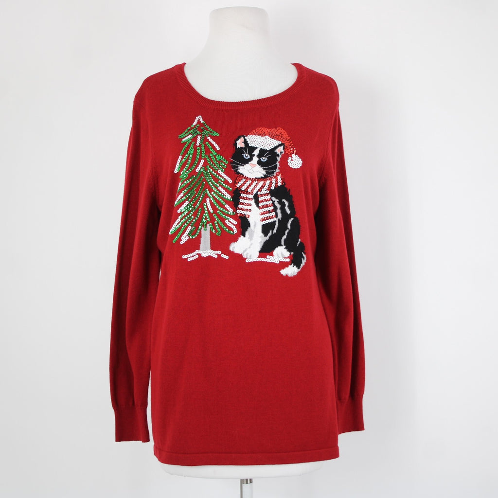 Quaker Factory Sz M Red Multi Sequin Kitty Cat With Xmas Tree Cotton Sweater