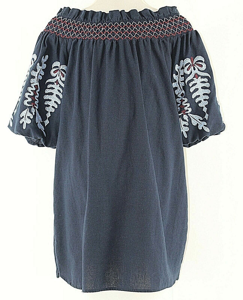 Rebellion M Navy Light Blue Red Embroidered 100% Cotton Peasant Top