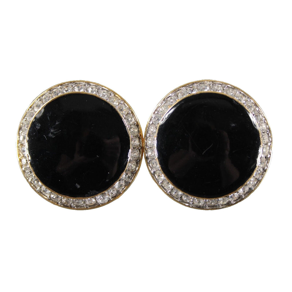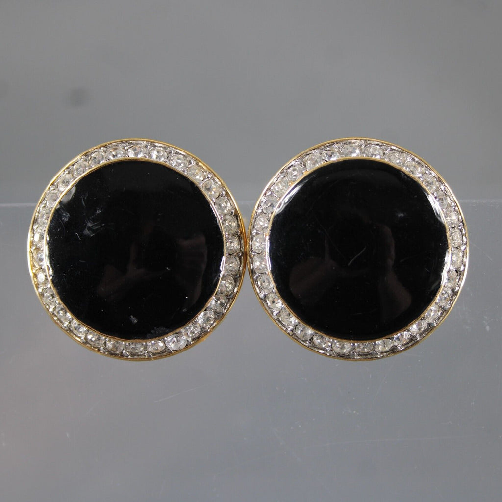 St John Goldtone Black Enamel Rhinestones Round 1.25" Huggie Clip On Earrings