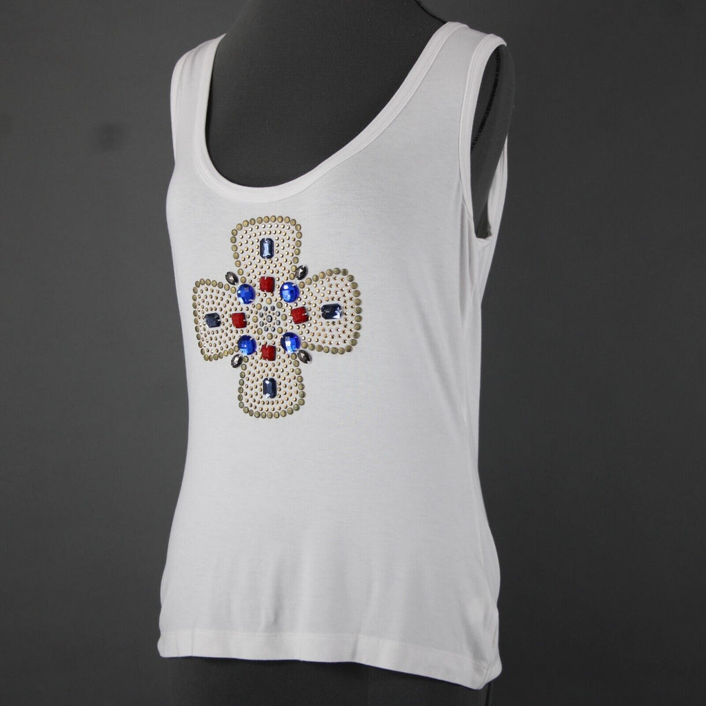 St John Jeans Sz M White Gold Studded Rhinestones Cross Rayon Spandex Tank Top