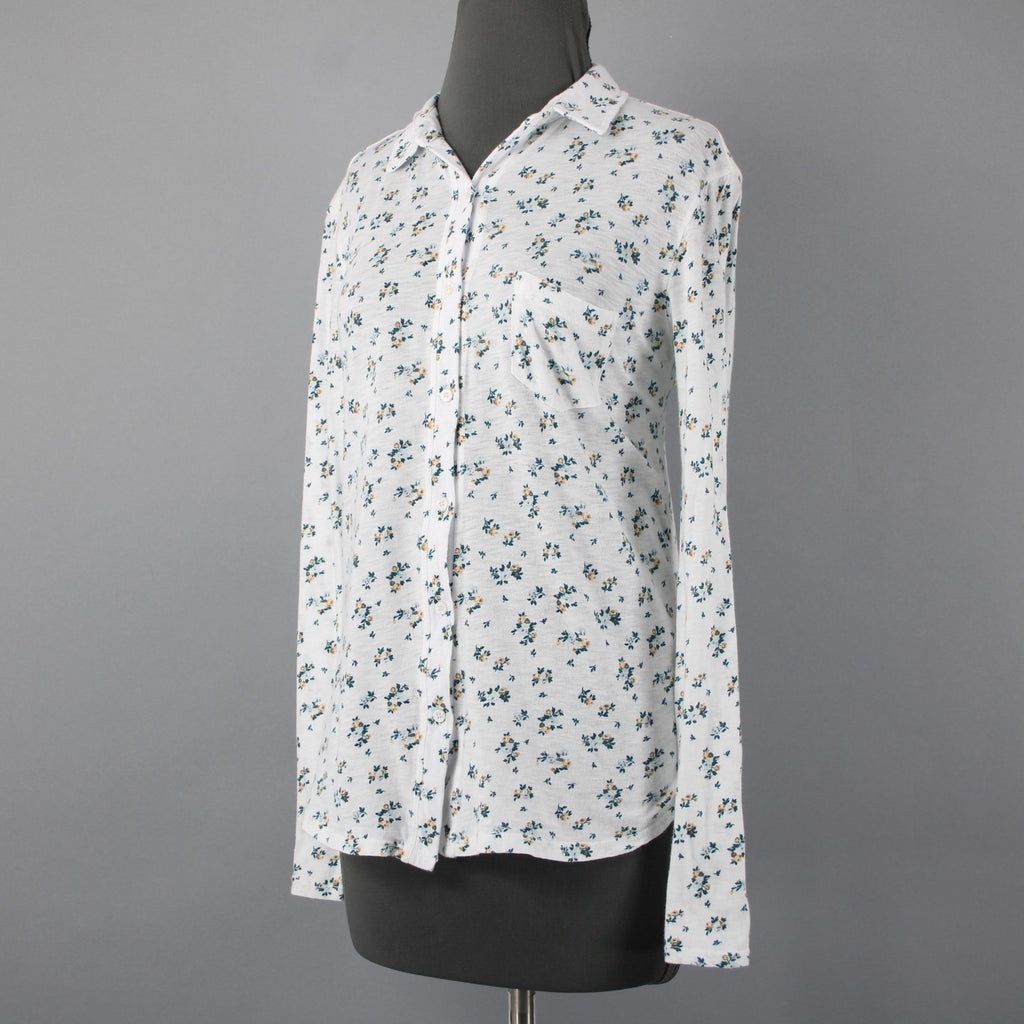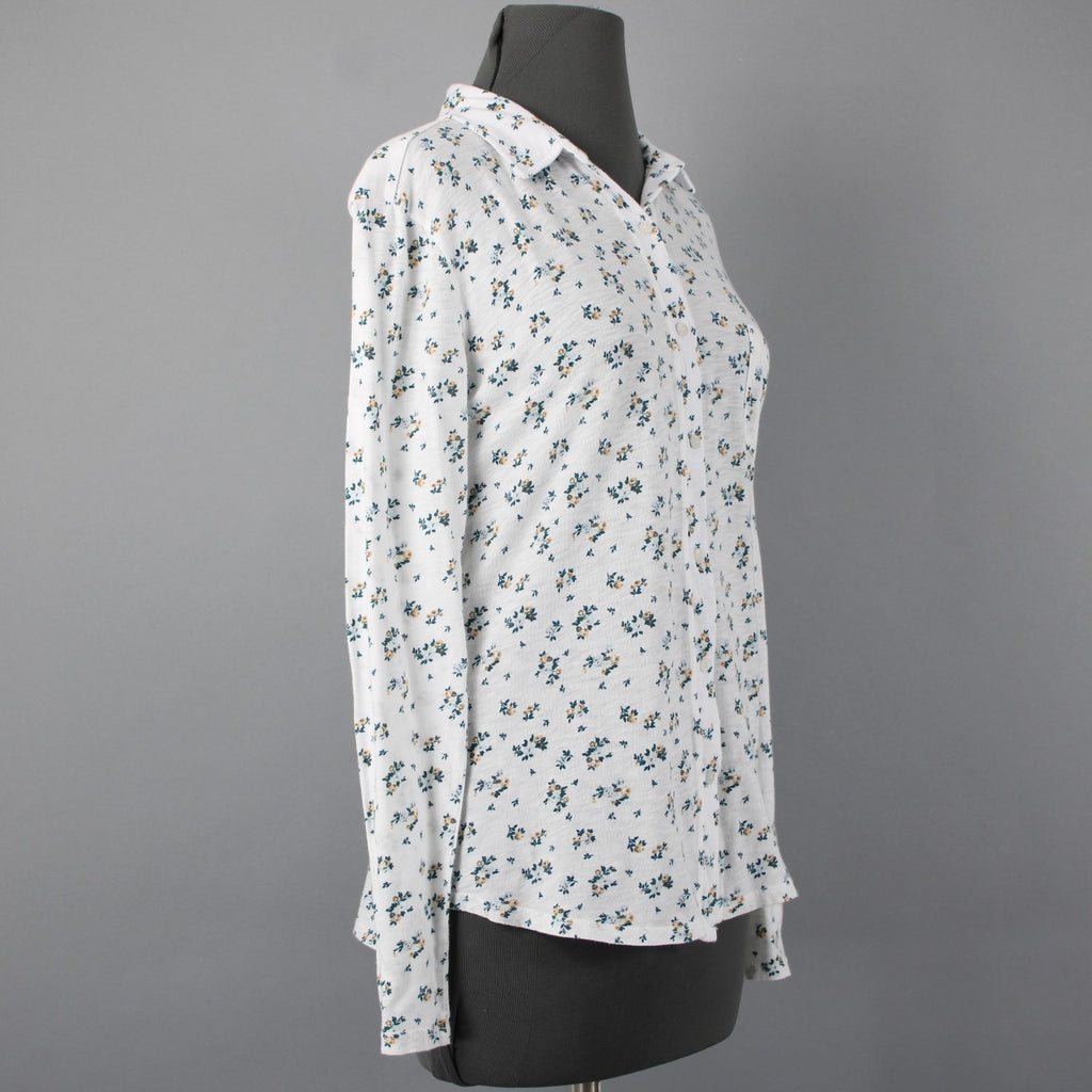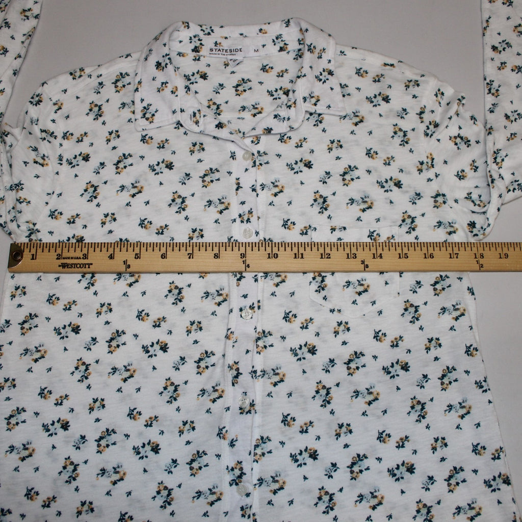 Stateside Sz M White Teal Gold Floral Button Front 100% Supima Cotton Knit Shirt
