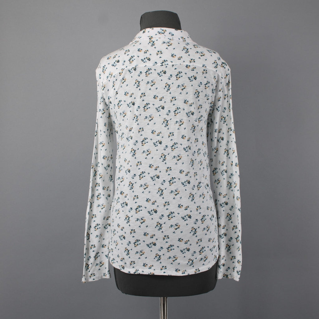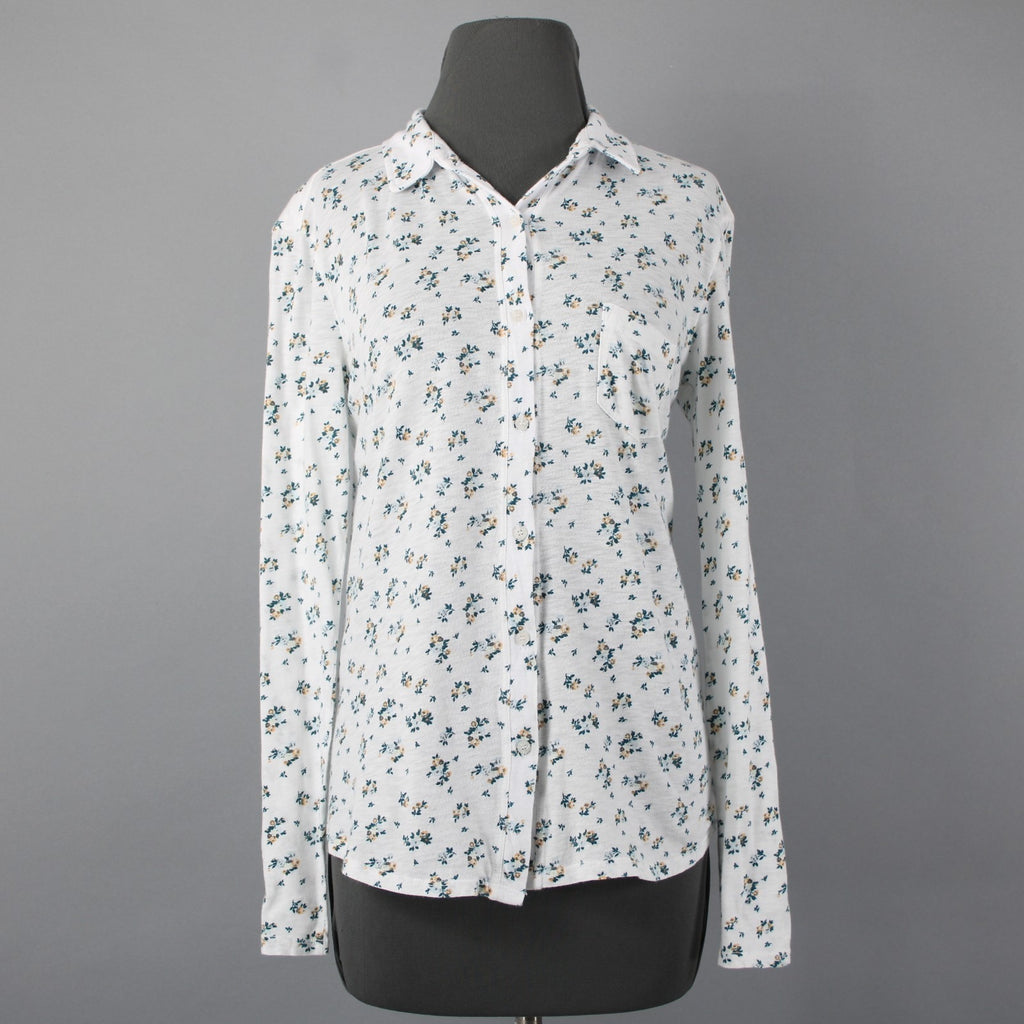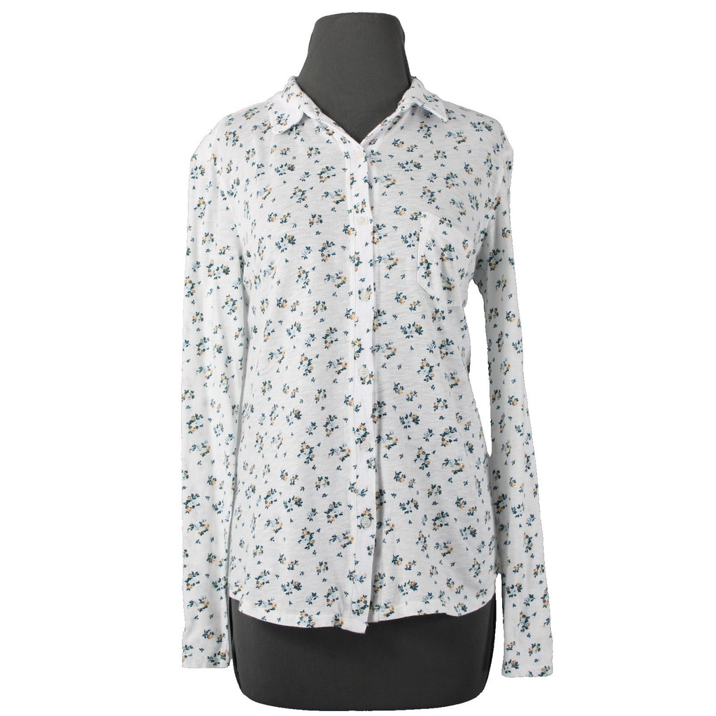 Stateside Sz M White Teal Gold Floral Button Front 100% Supima Cotton Knit Shirt