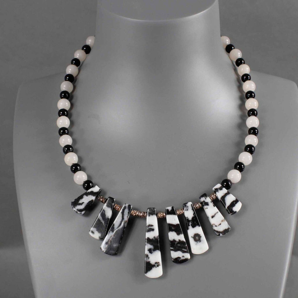 Sterling Silver 925 18" Ext 2" Black White Beaded Snowflake Obsidian Necklace