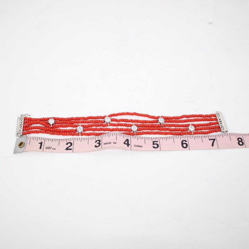 Sterling Silver Red Beaded CZ Station Multi Strand 7.5" Double Safety Bracelet