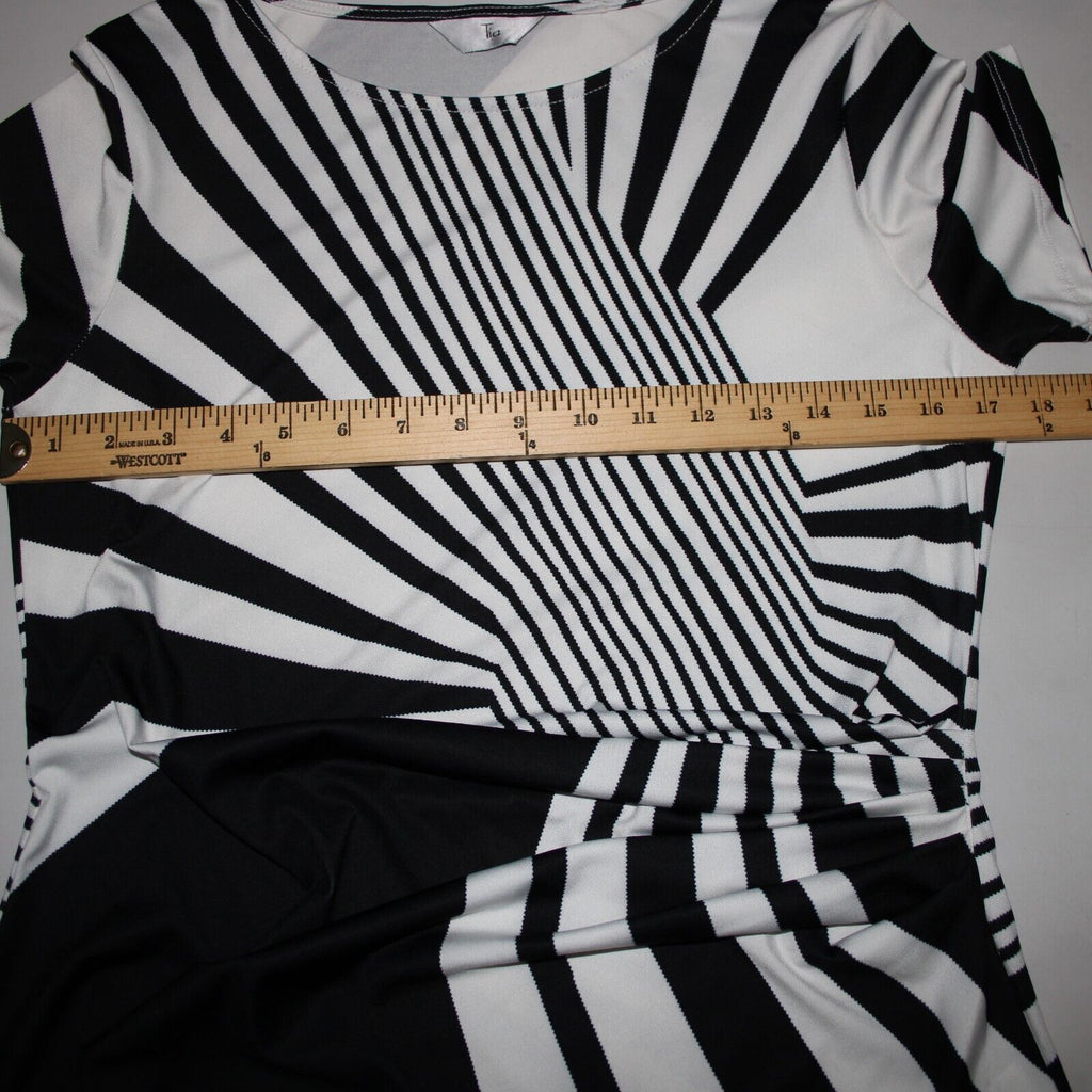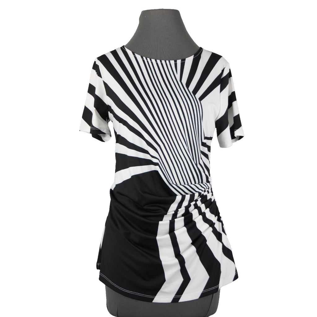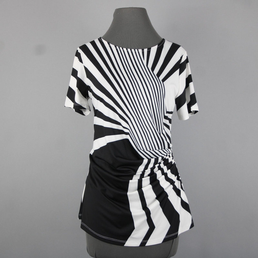 Tia Sz 8 White Black Abstract Pleated Short Sleeve Round Neck Poly Elasthan Top