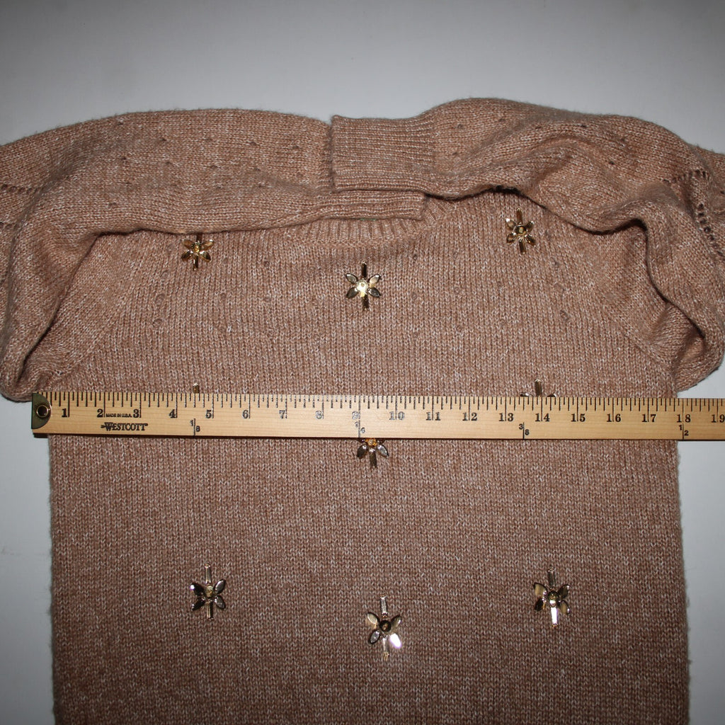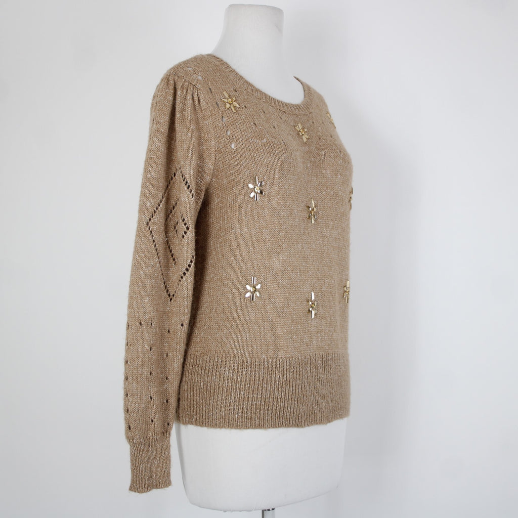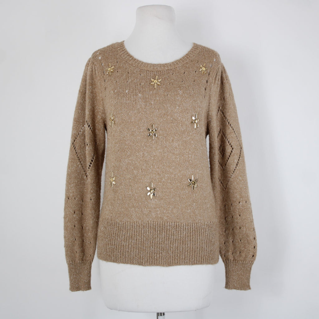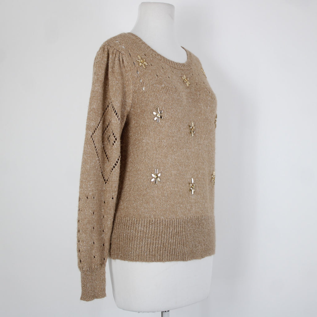 Tribal Jeans Sz SP Brown Rhinestones Open Knit Acrylic Polyester Nylon Sweater